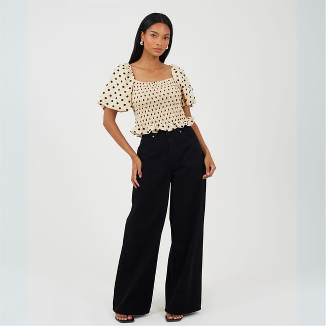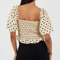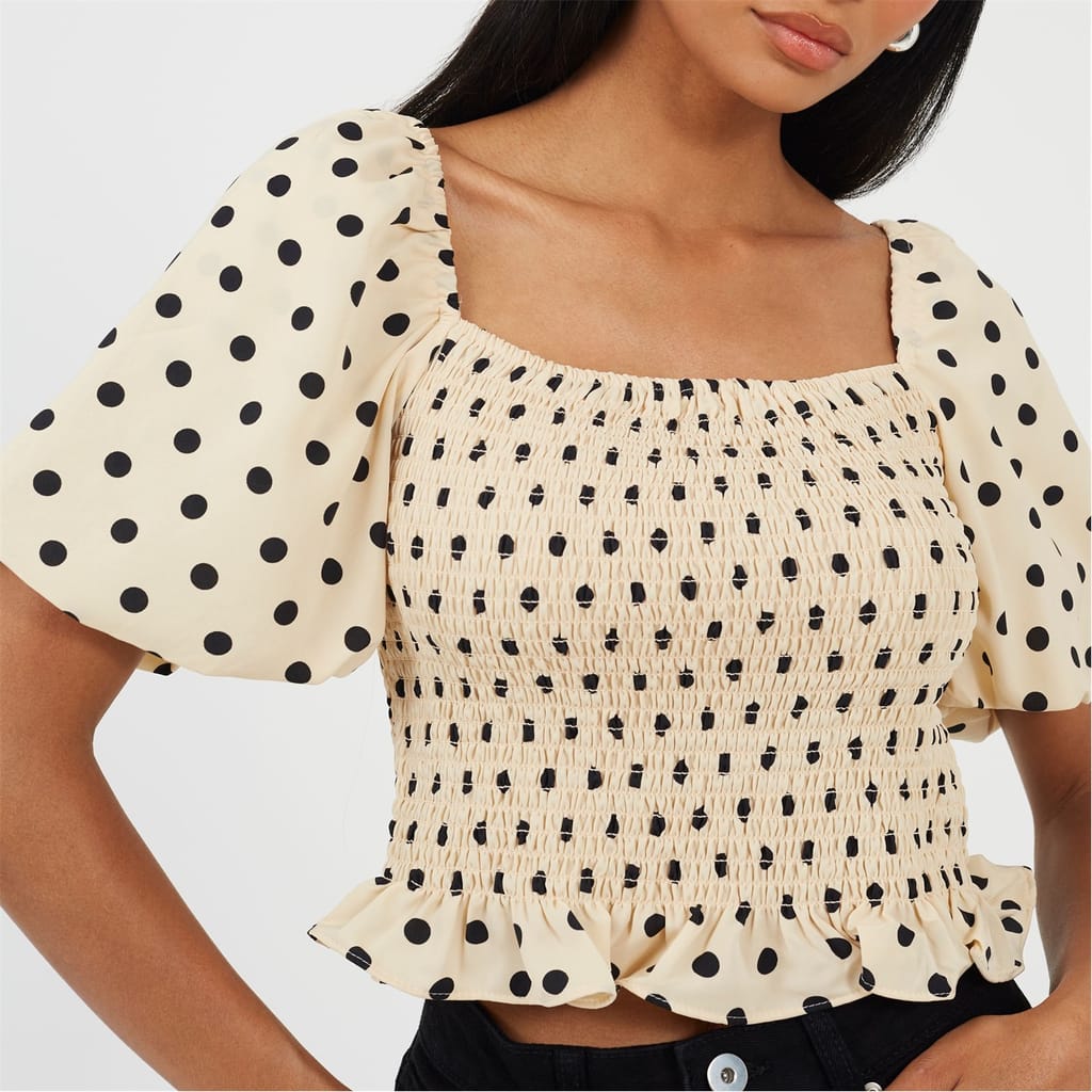 Brave Soul Women's top. Short puff sleeve, square neck and square back. Shirred bust and body, frill to hem. All over polka dot pattern. -