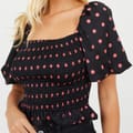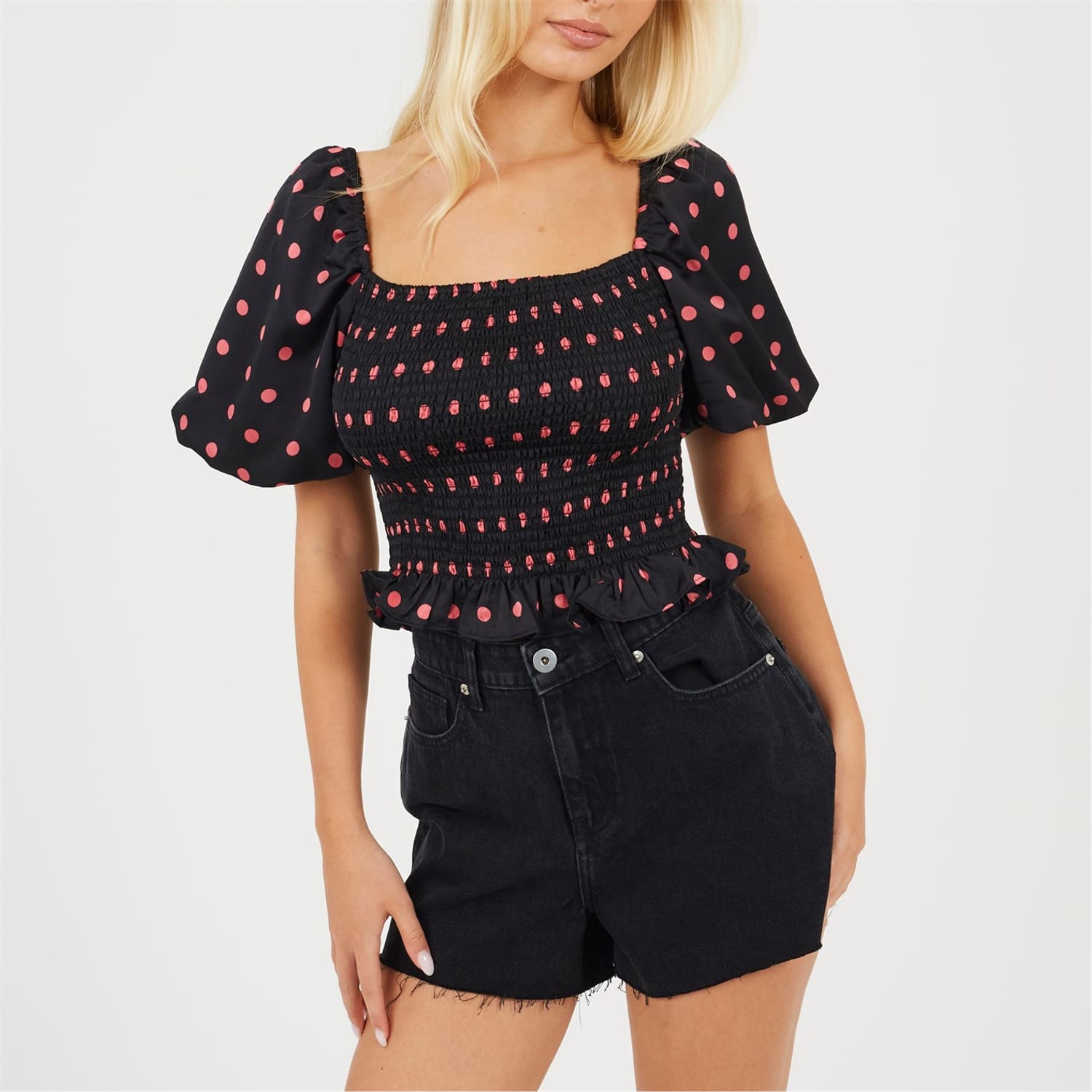 Brave Soul Women's top. Short puff sleeve, square neck and square back. Shirred bust and body, frill to hem. All over polka dot pattern. -