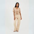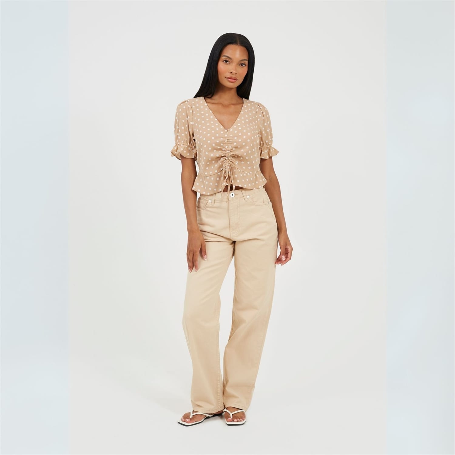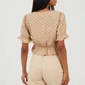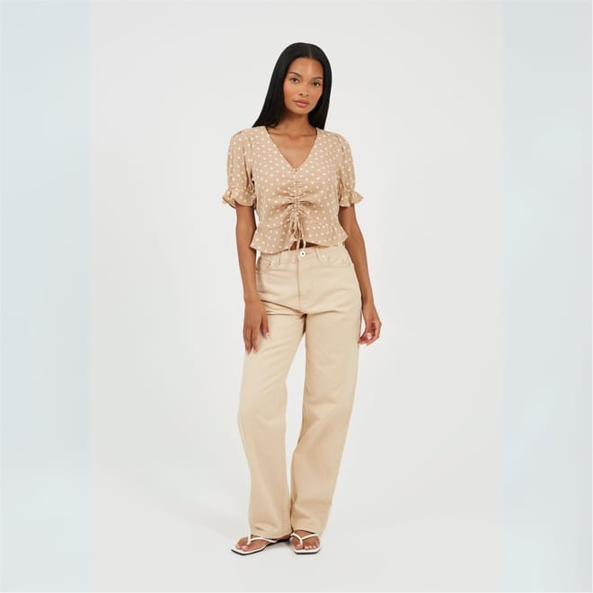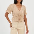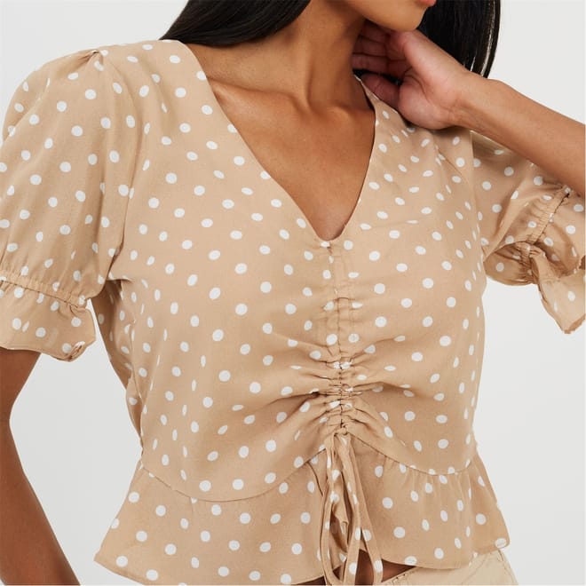 Brave Soul Women's top. Short sleeve with frill cuffs, V-neck. Loose frill hem, central ruching detail with adjustable tie. All over polka dot pattern. -
