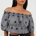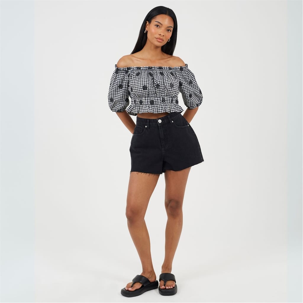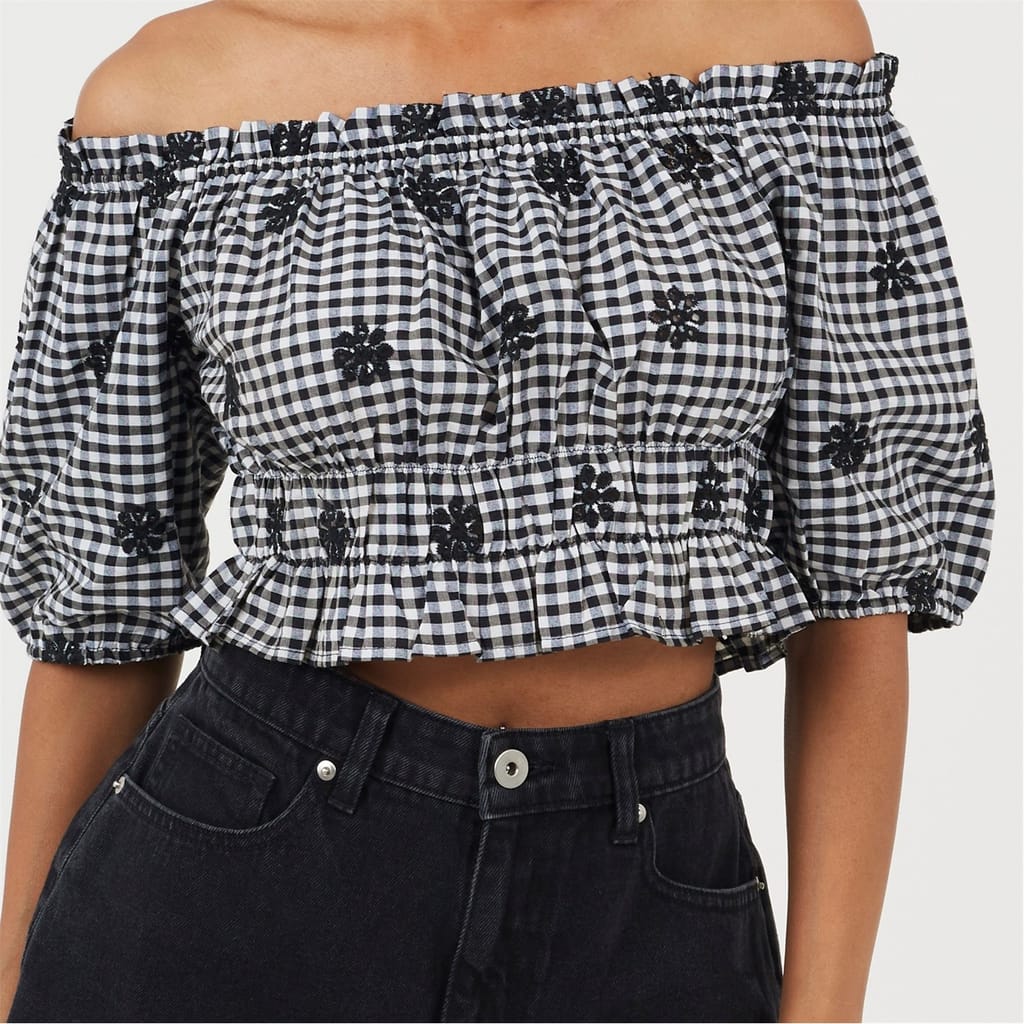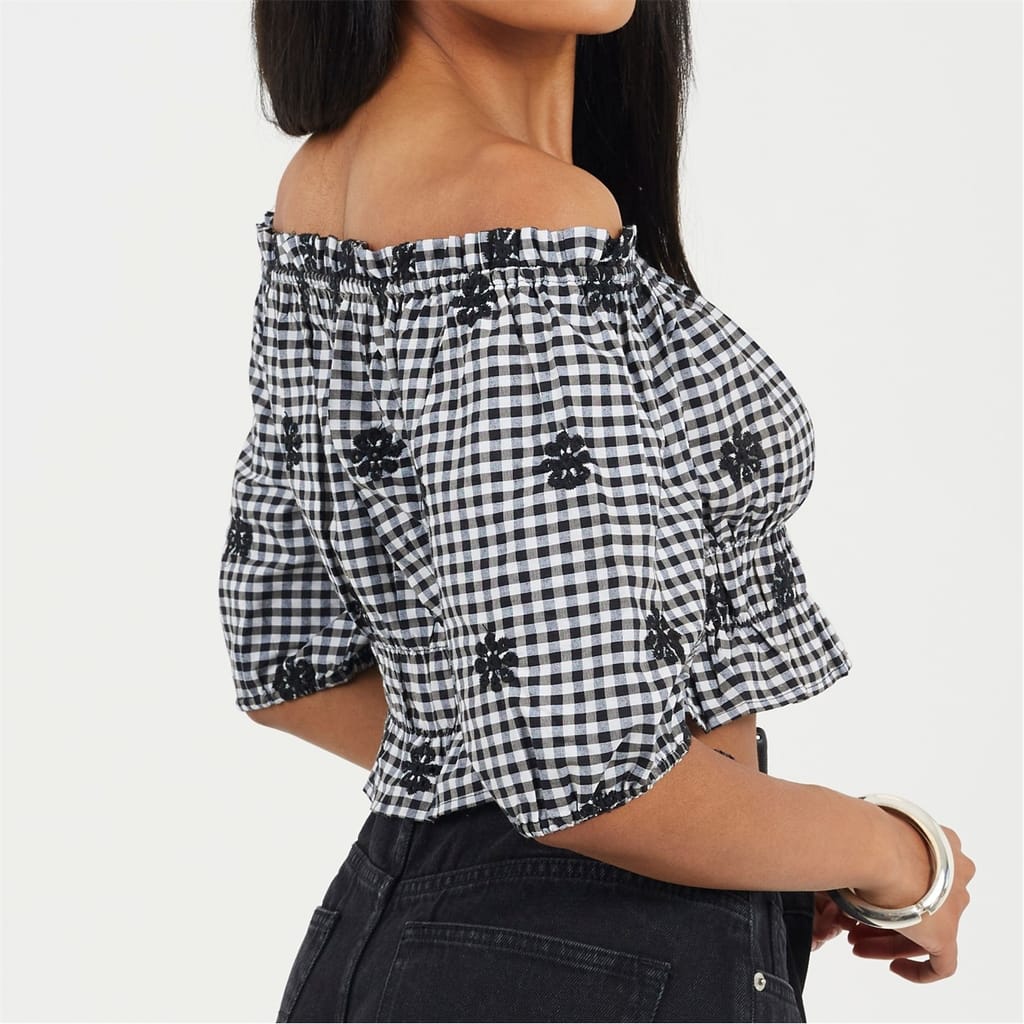 Brave Soul Women's top. Bardot style with short puff sleeves. Gingham fabric body with Broderie Anglaise details, elasticated hem with frill. -