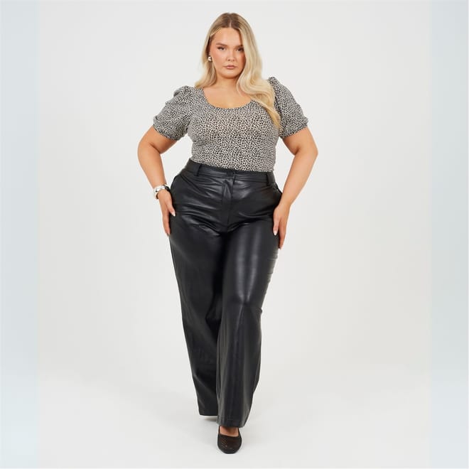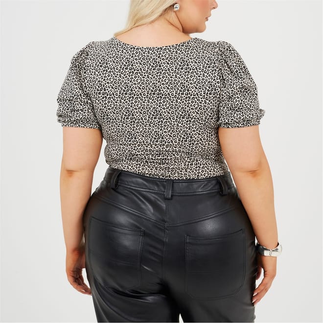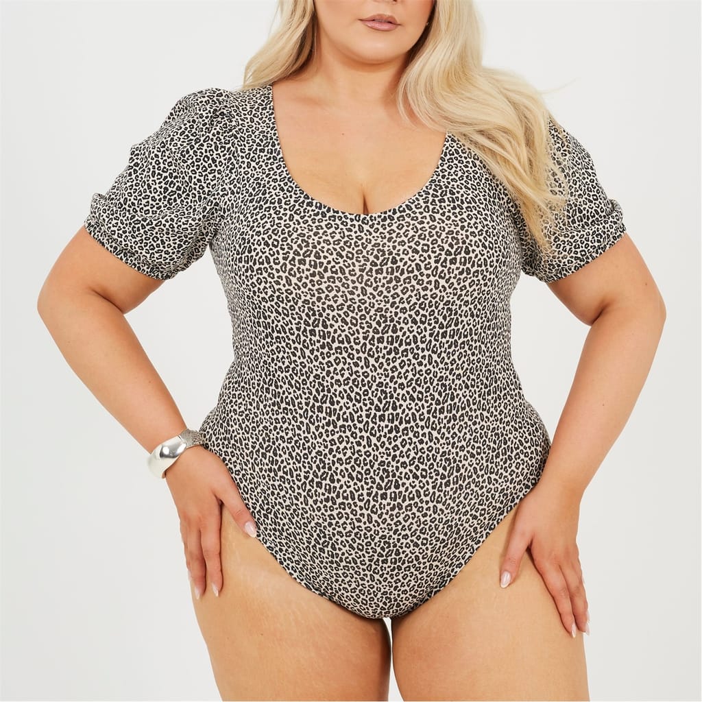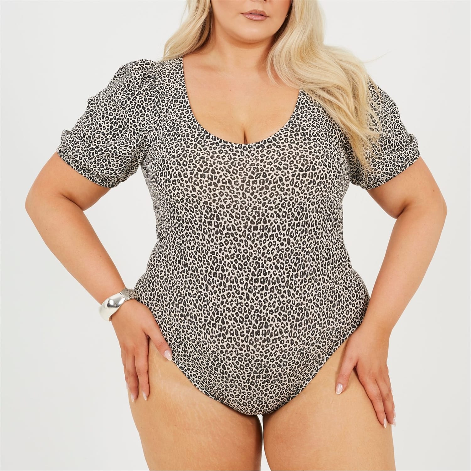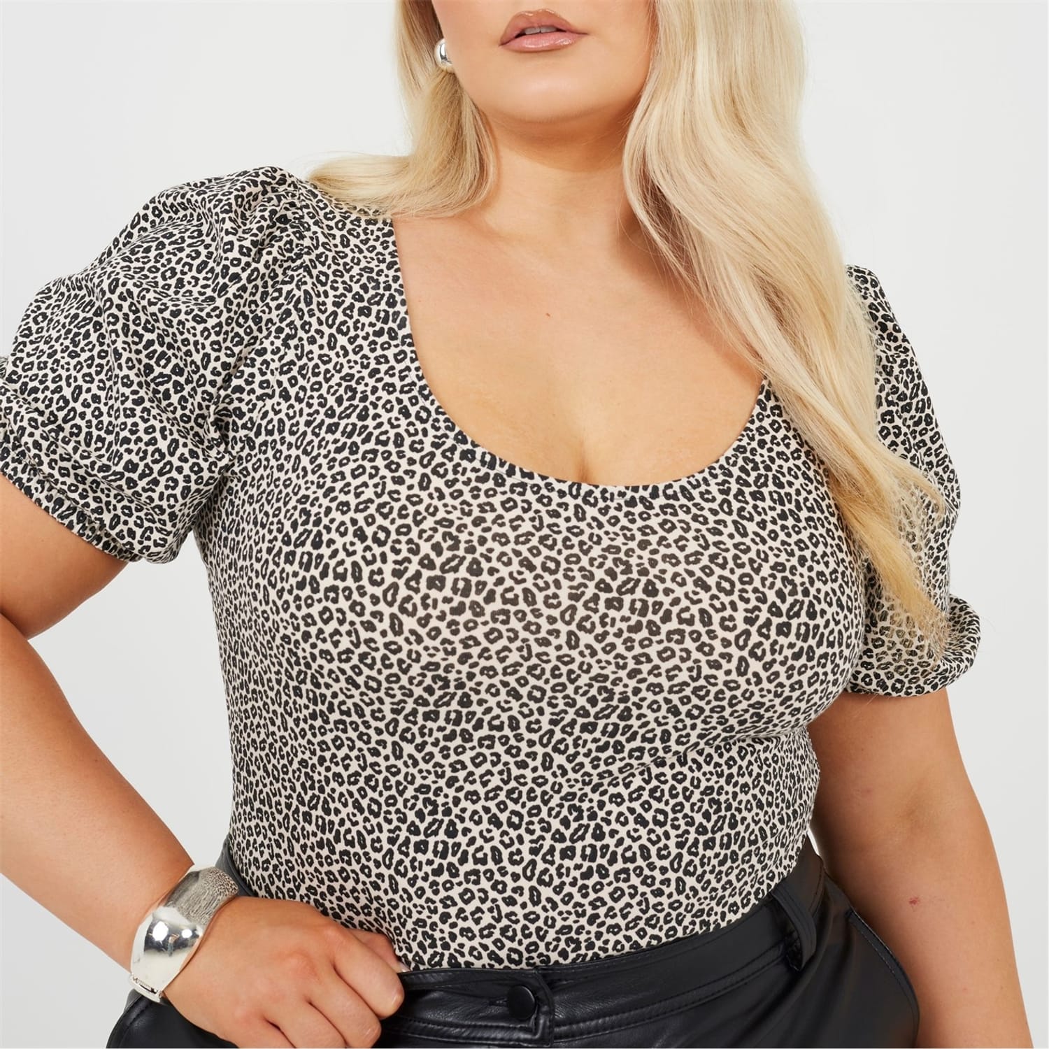 Brave Soul Women's bodysuit. Plus Size, short puff sleeves, round neck. All over animal print. -