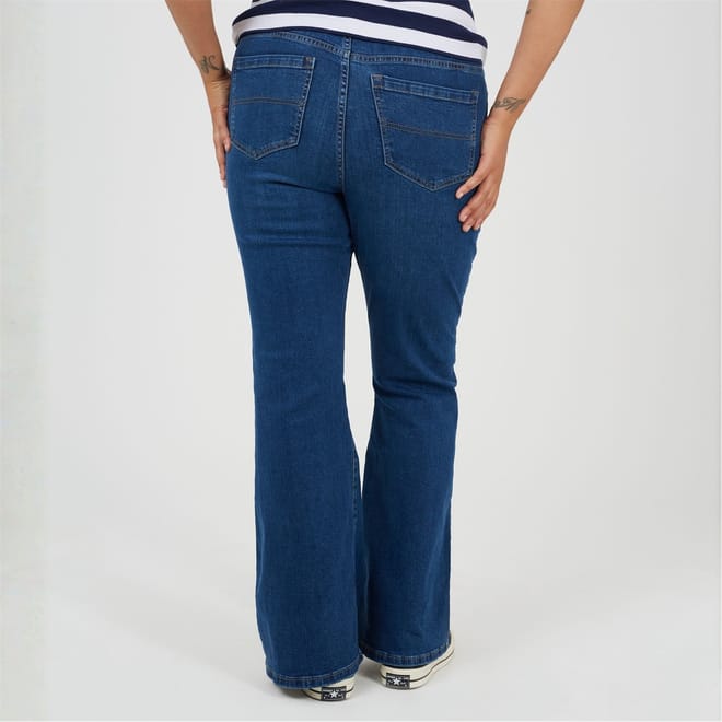 Brave Soul Women's jeans. Plus size, high waisted, flared leg. Two waist pockets, two back pockets, mid blue wash. -