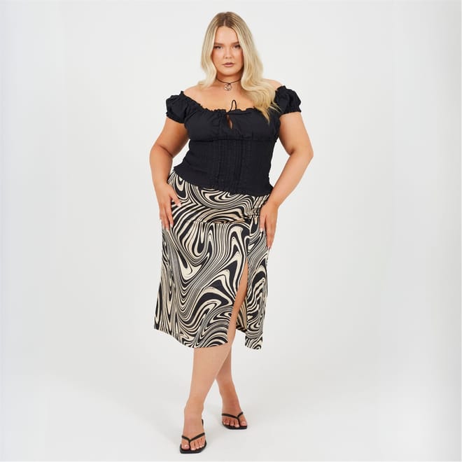 Brave Soul Women's skirt. Plus Size, midi length, all over swirl print. Side split detail, fabric button detail to one side, -