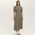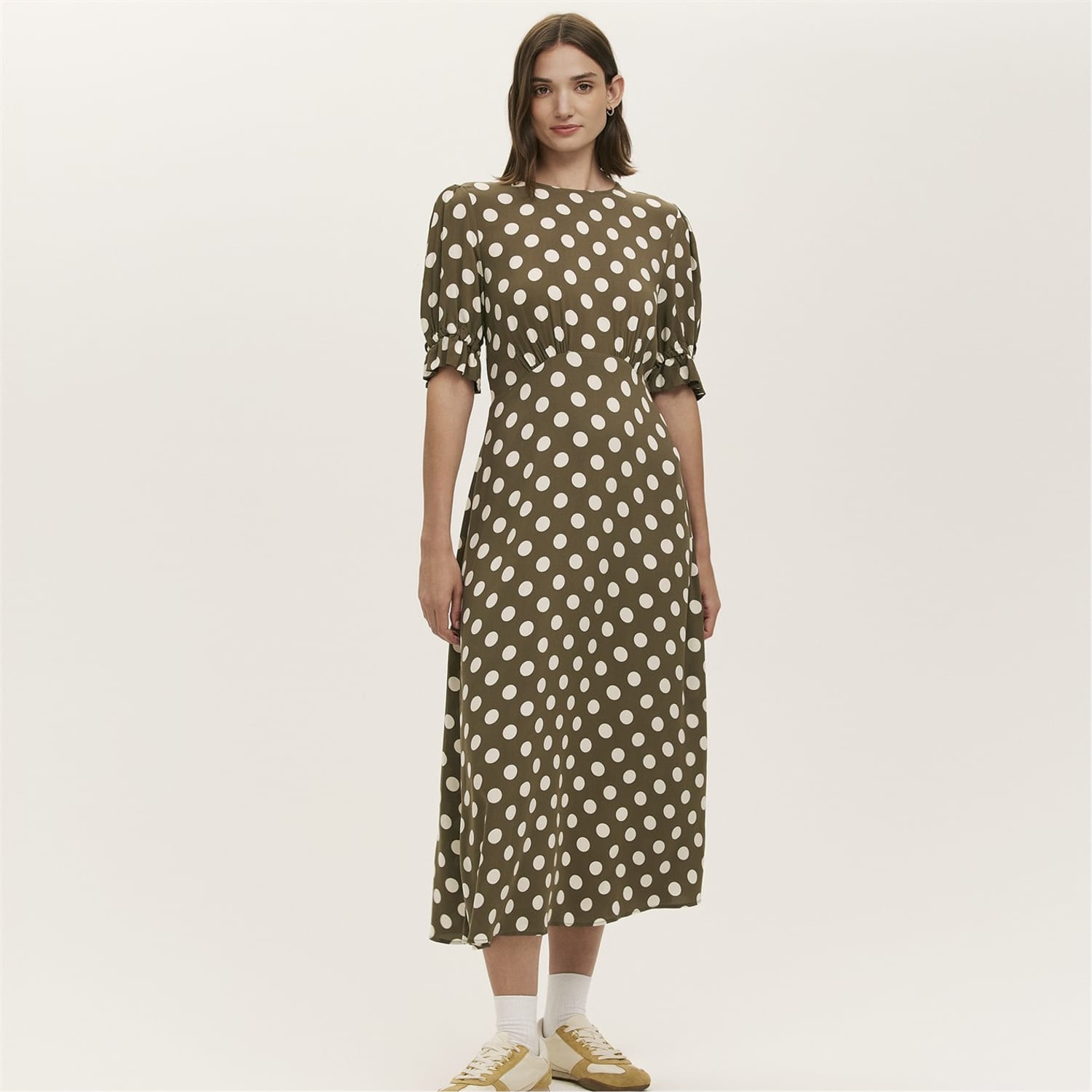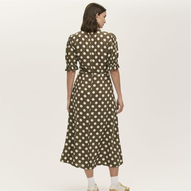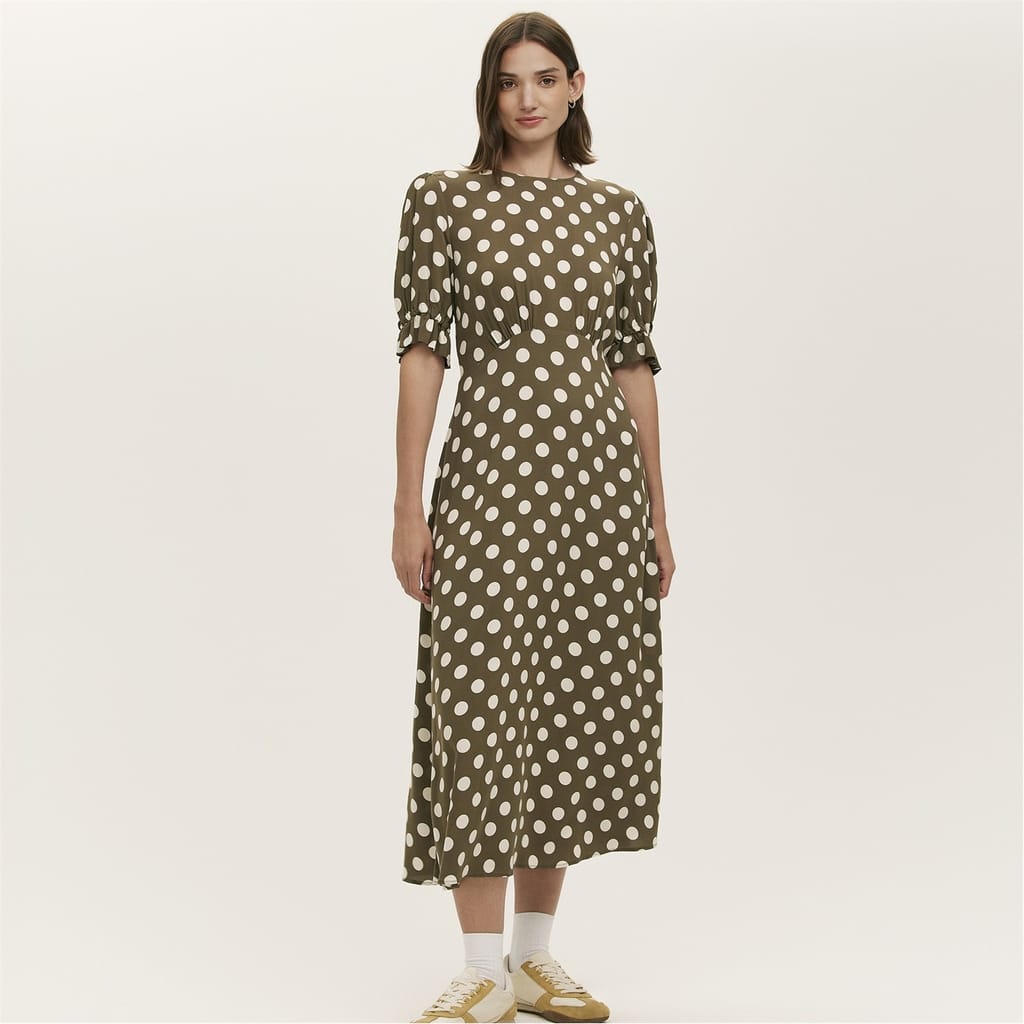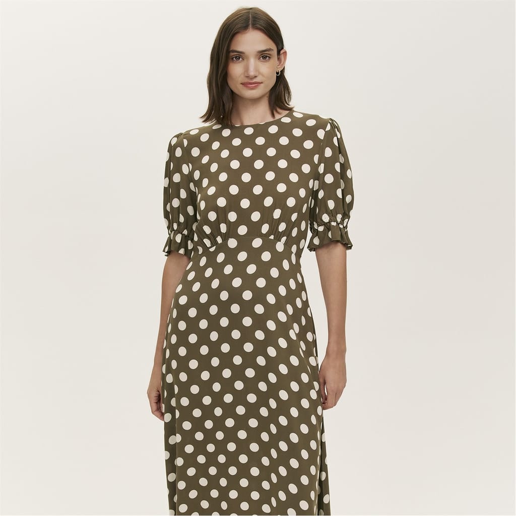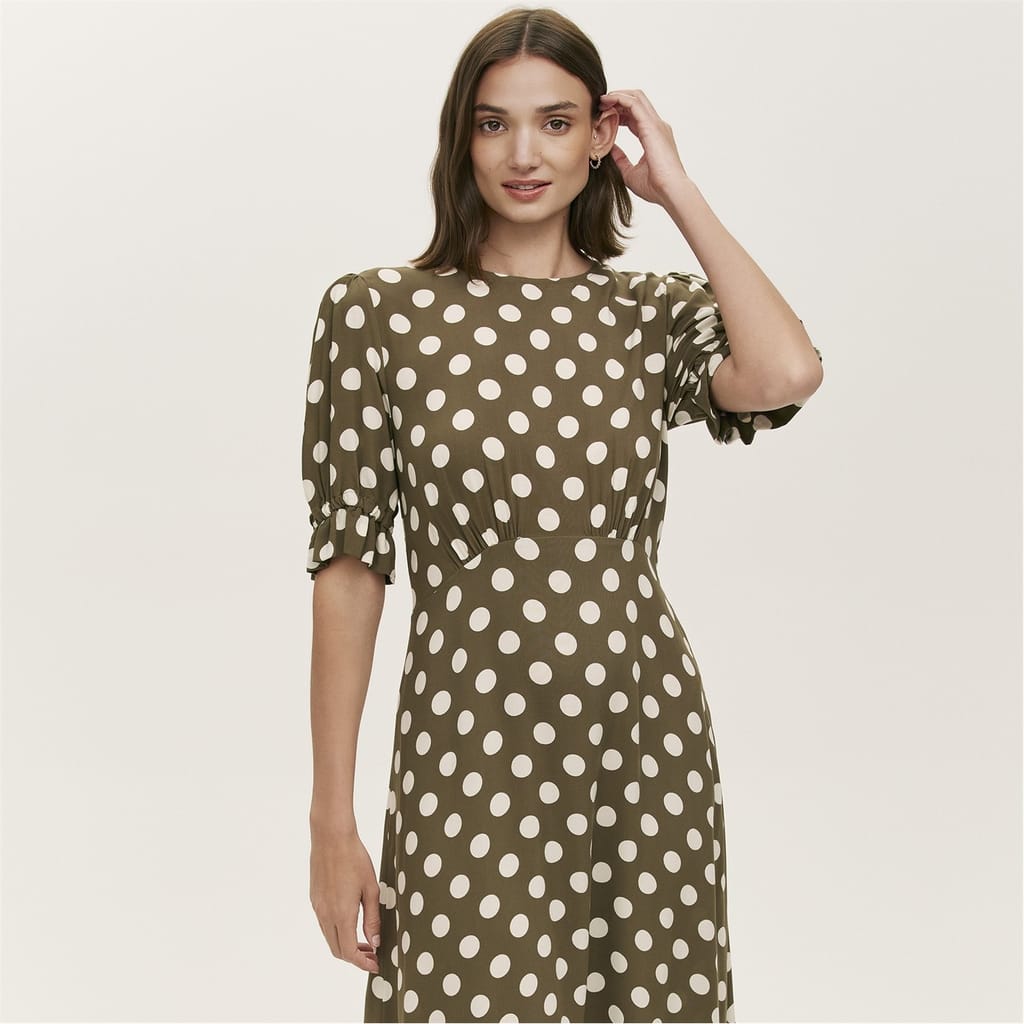 This Finery midi A-line dress features a charming polka dot pattern, perfect for adding a touch of elegance to your wardrobe. The dress is designed with a crew neck and short puff sleeves, offering a stylish yet comfortable fit. Its straight hemline and regular fit ensure a flattering silhouette, making it a versatile choice for various occasions. -