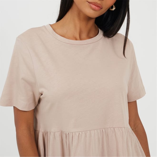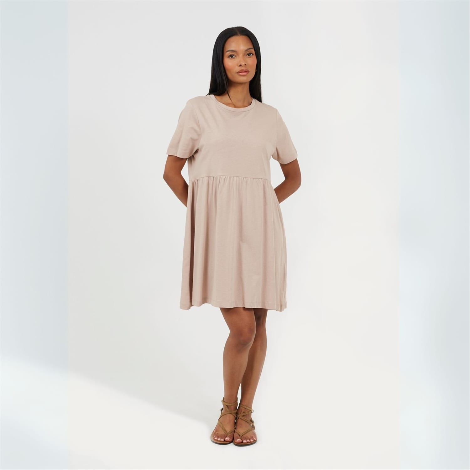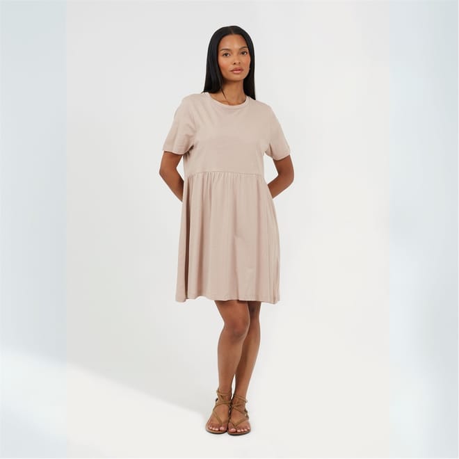 This Brave Soul babydoll dress is a charming addition to your wardrobe. Featuring a smocked design, it comes in a mini length with a solid pattern. The dress is styled with a band collar and a crew neck, complemented by short sleeves. Its straight hemline adds a neat finish, making it a versatile choice for various occasions. -