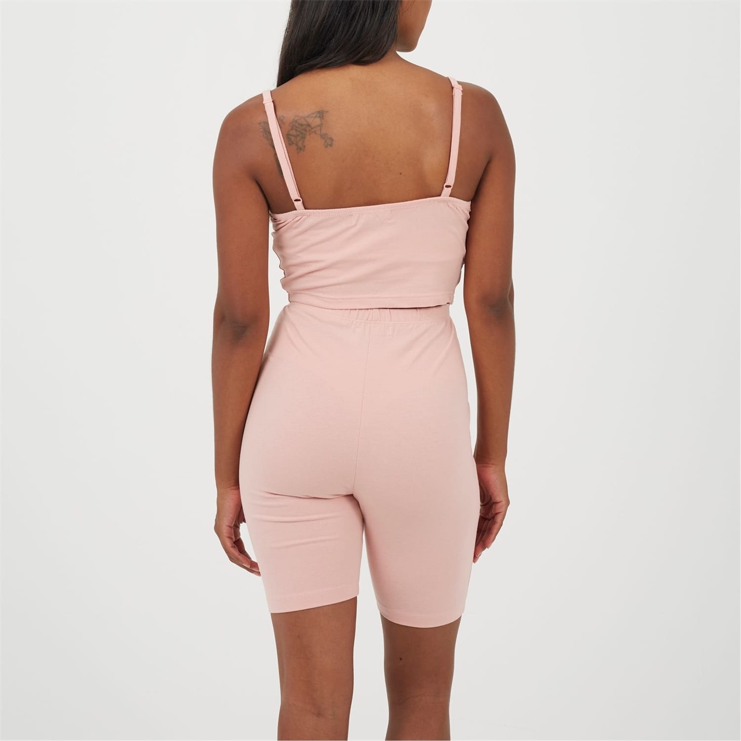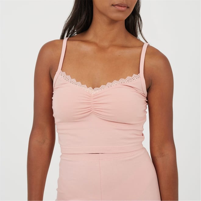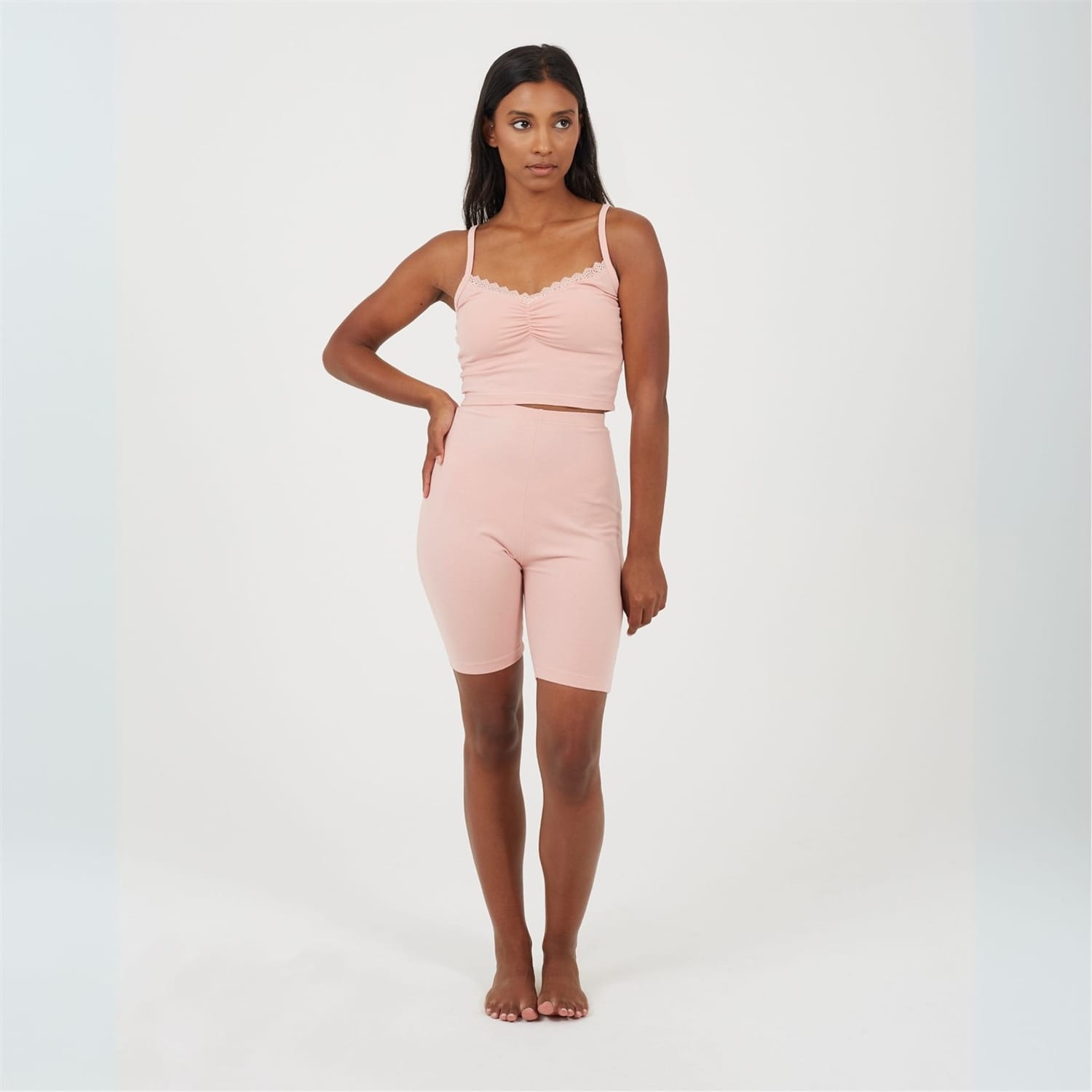 Brave Soul Women's lounge set. Cropped strappy vest with adjustable straps. Front ruching and lace detail to neckline, matching cycling shorts, all in solid colourway. -