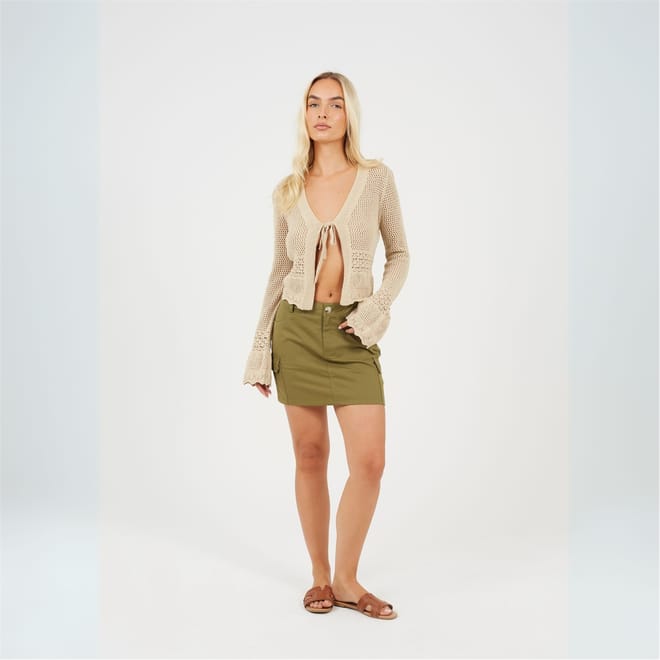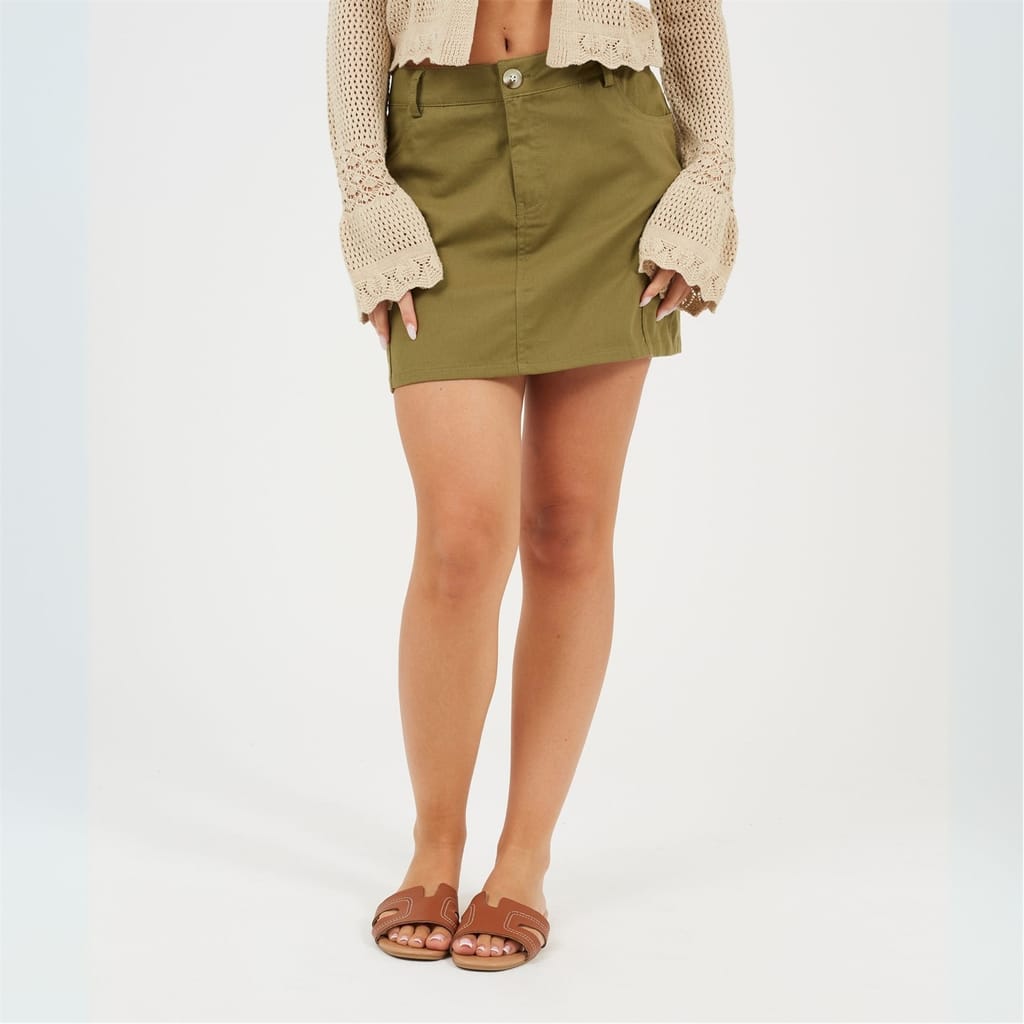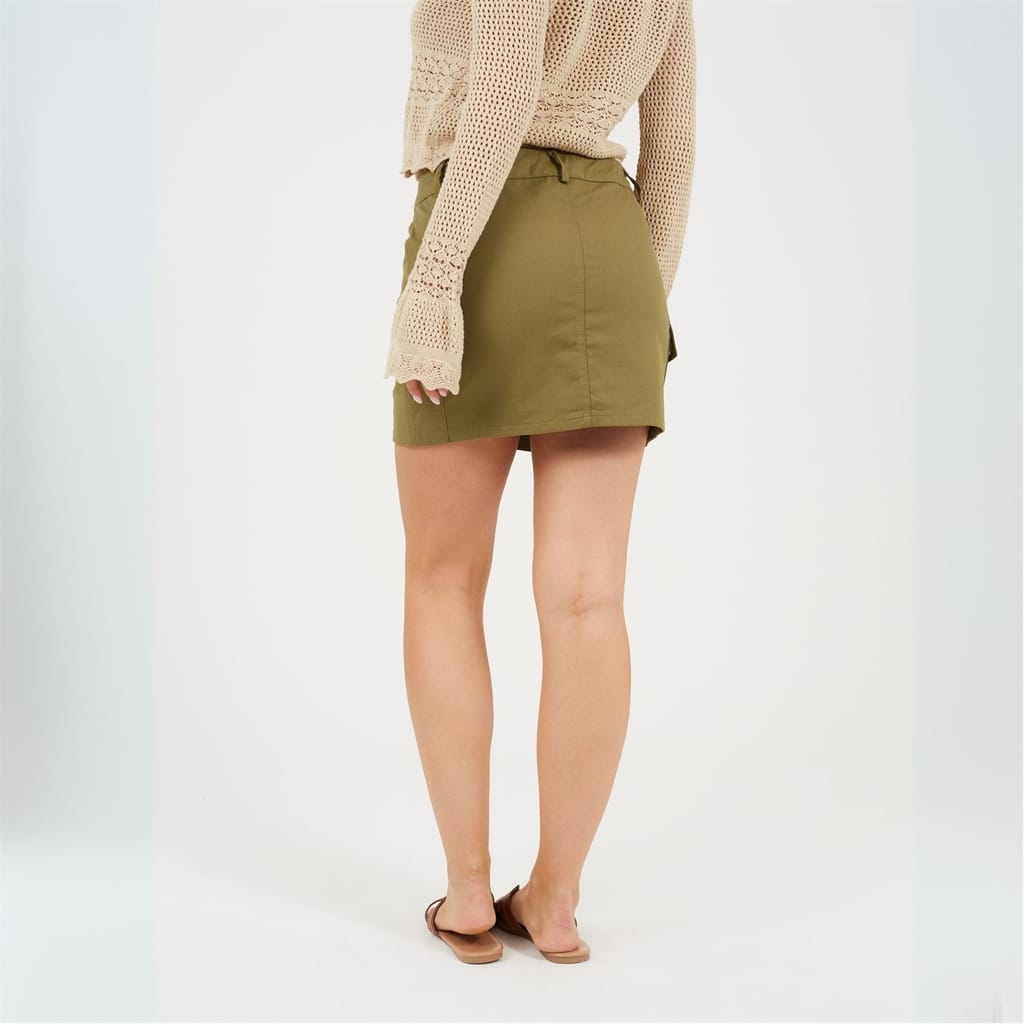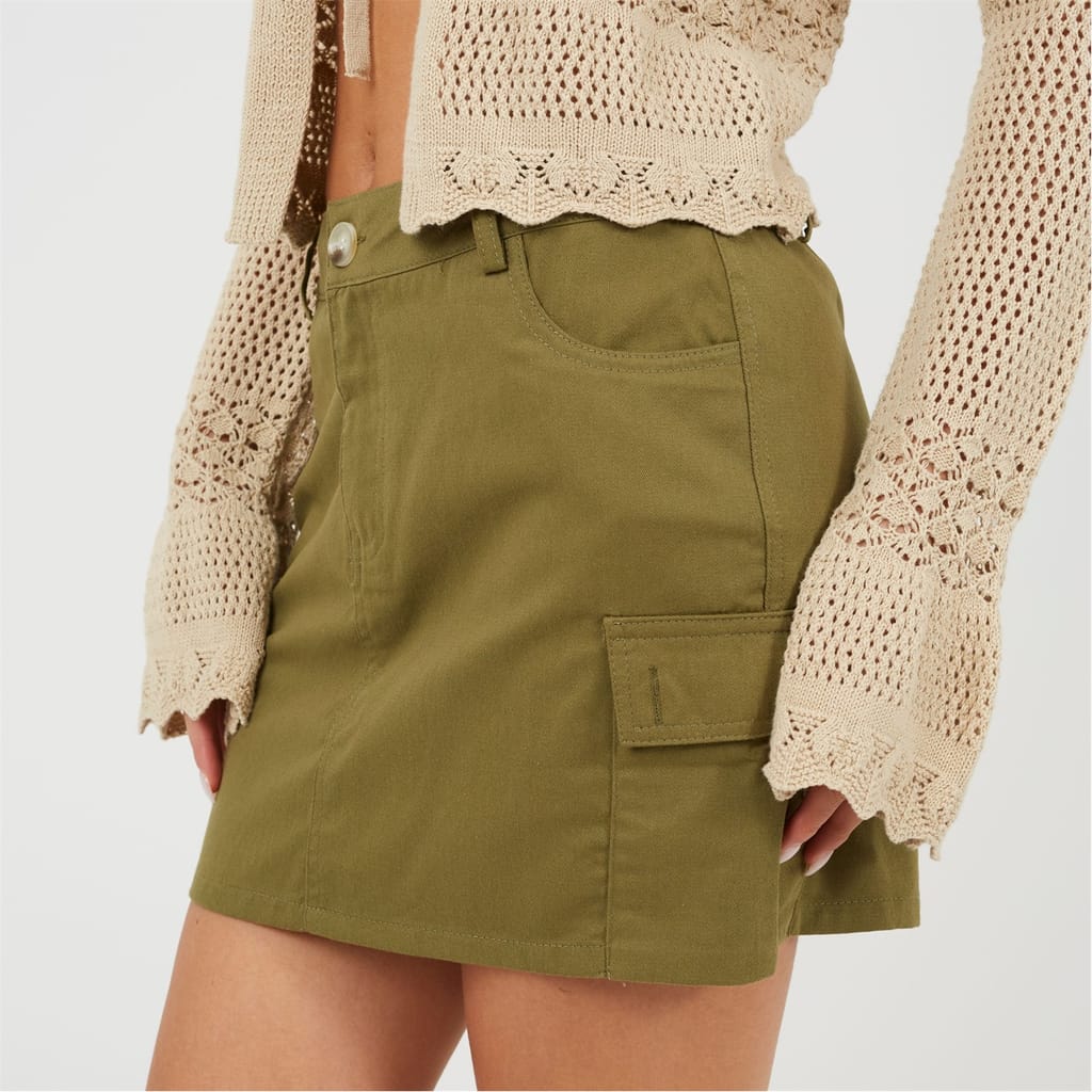 Brave Soul Womens skirt. Mini length, button and zip fastening, belt loops to waist. Two cargo pockets to thigh, solid colourway. -