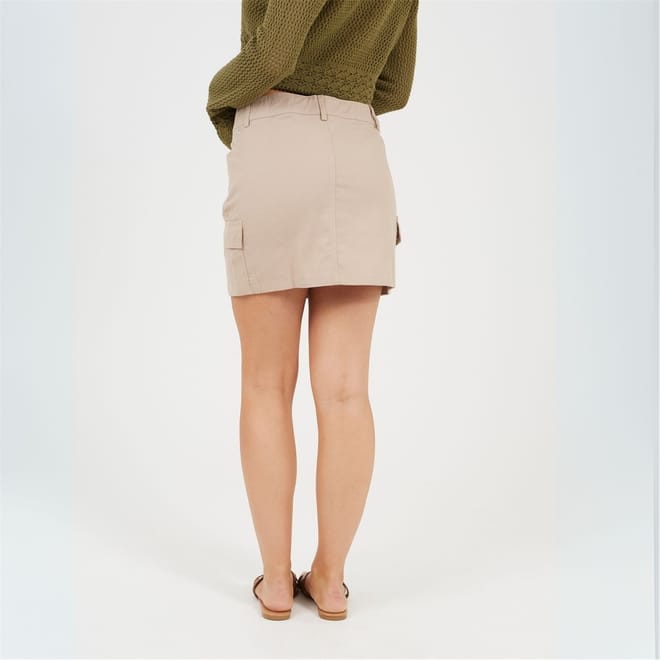 Brave Soul Womens skirt. Mini length, button and zip fastening, belt loops to waist. Two cargo pockets to thigh, solid colourway. -