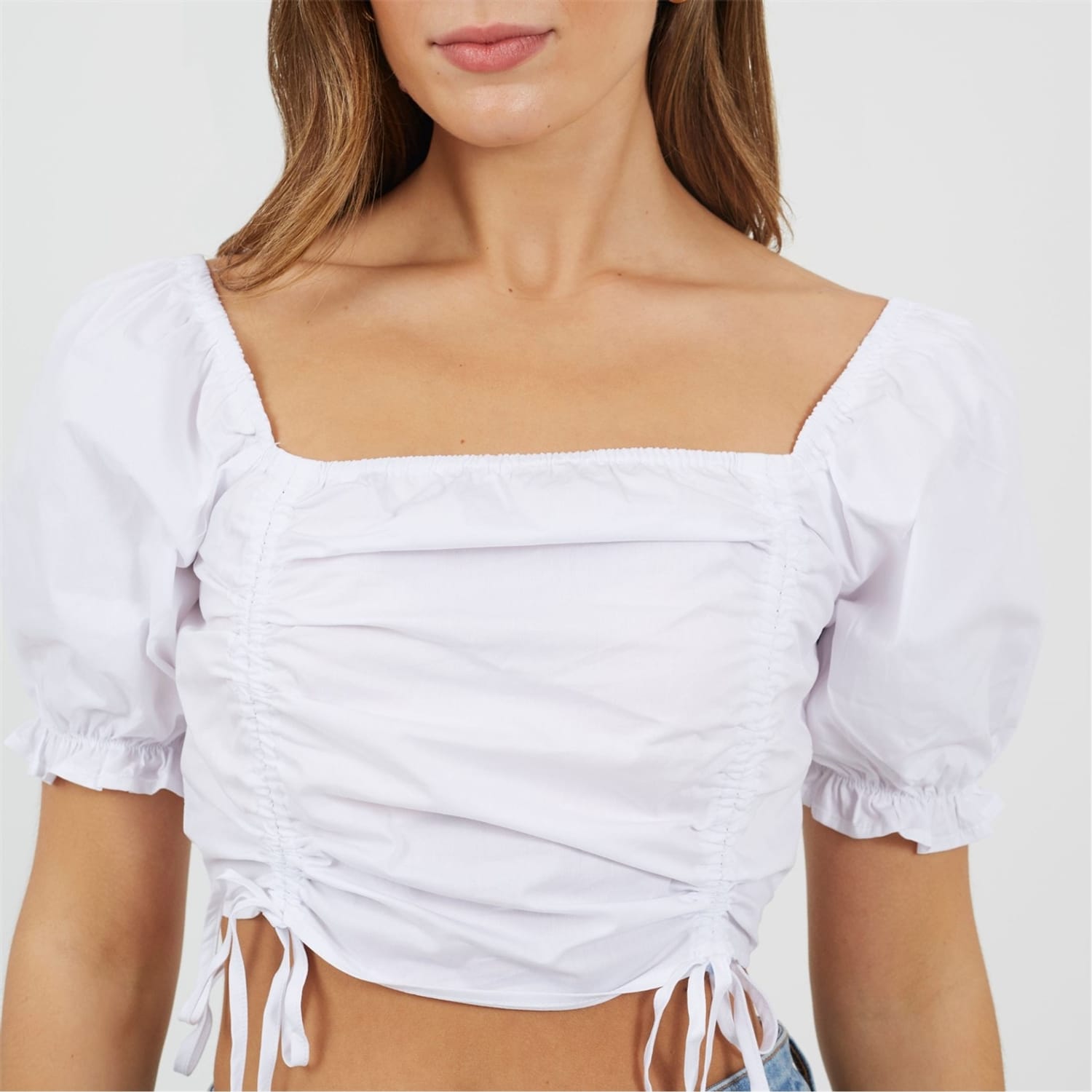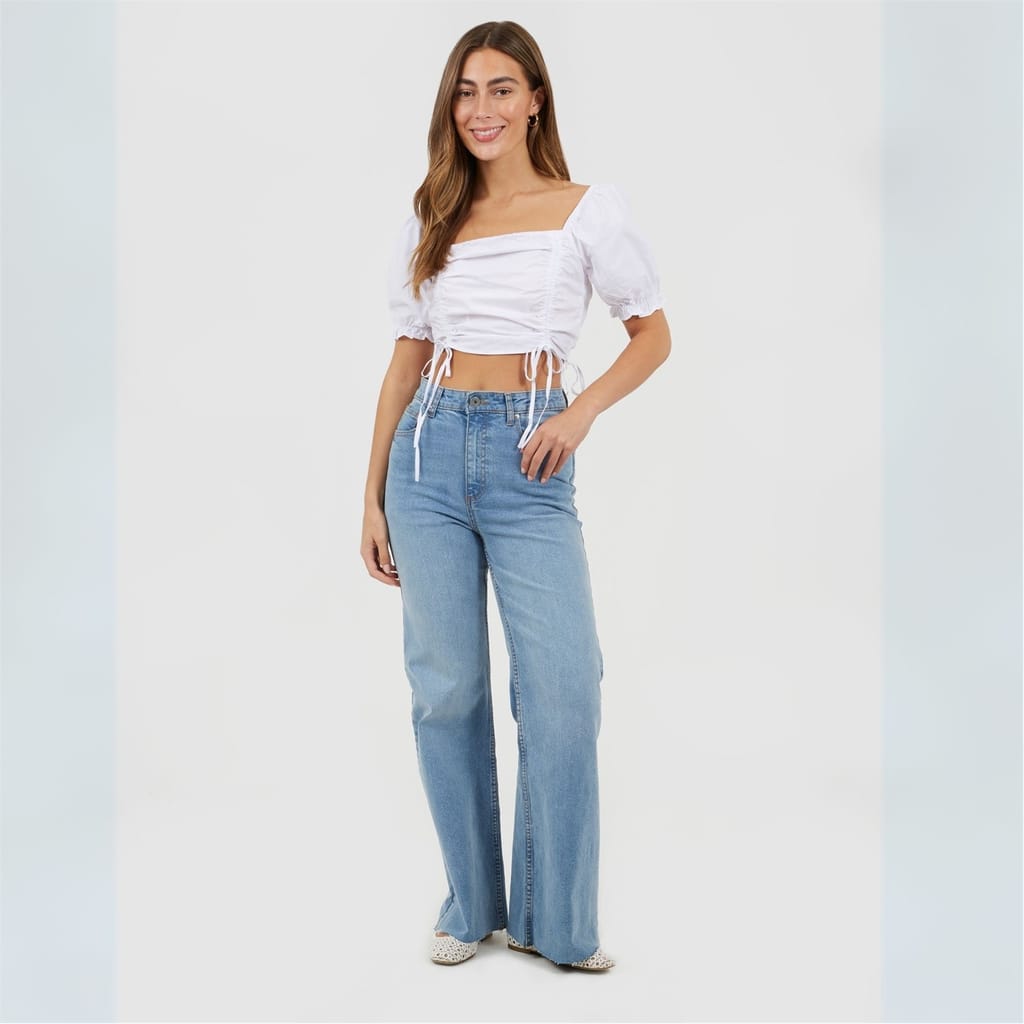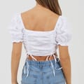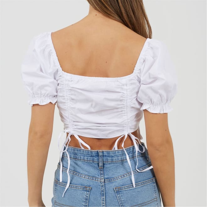 Brave Soul Women's top. Short puff sleeve with elasticated hems, square neck and square back. Front ruching detail with adjuatble ties. Pleated bust, solid colourway. -