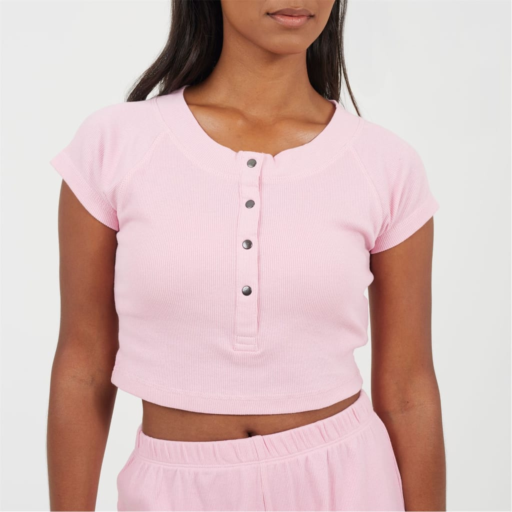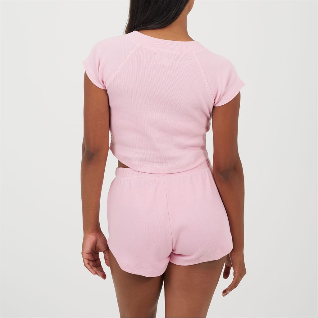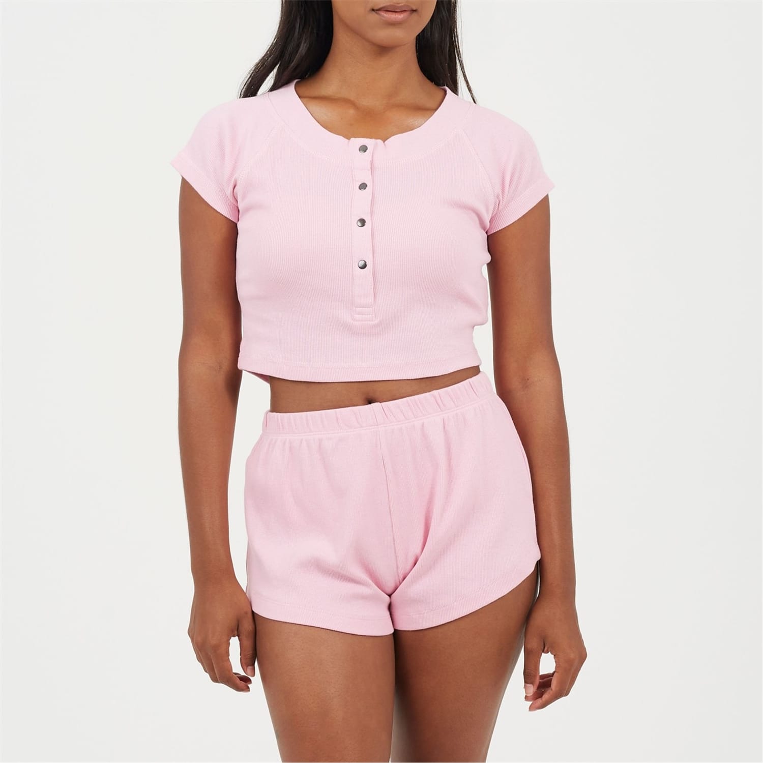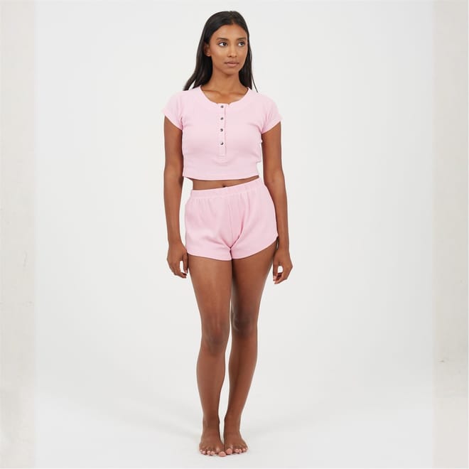 Brave Soul Women's lounge set. Cropped henley style t-shirt with short sleeves and scoop neck. Matching shorts with elasticated waist. -