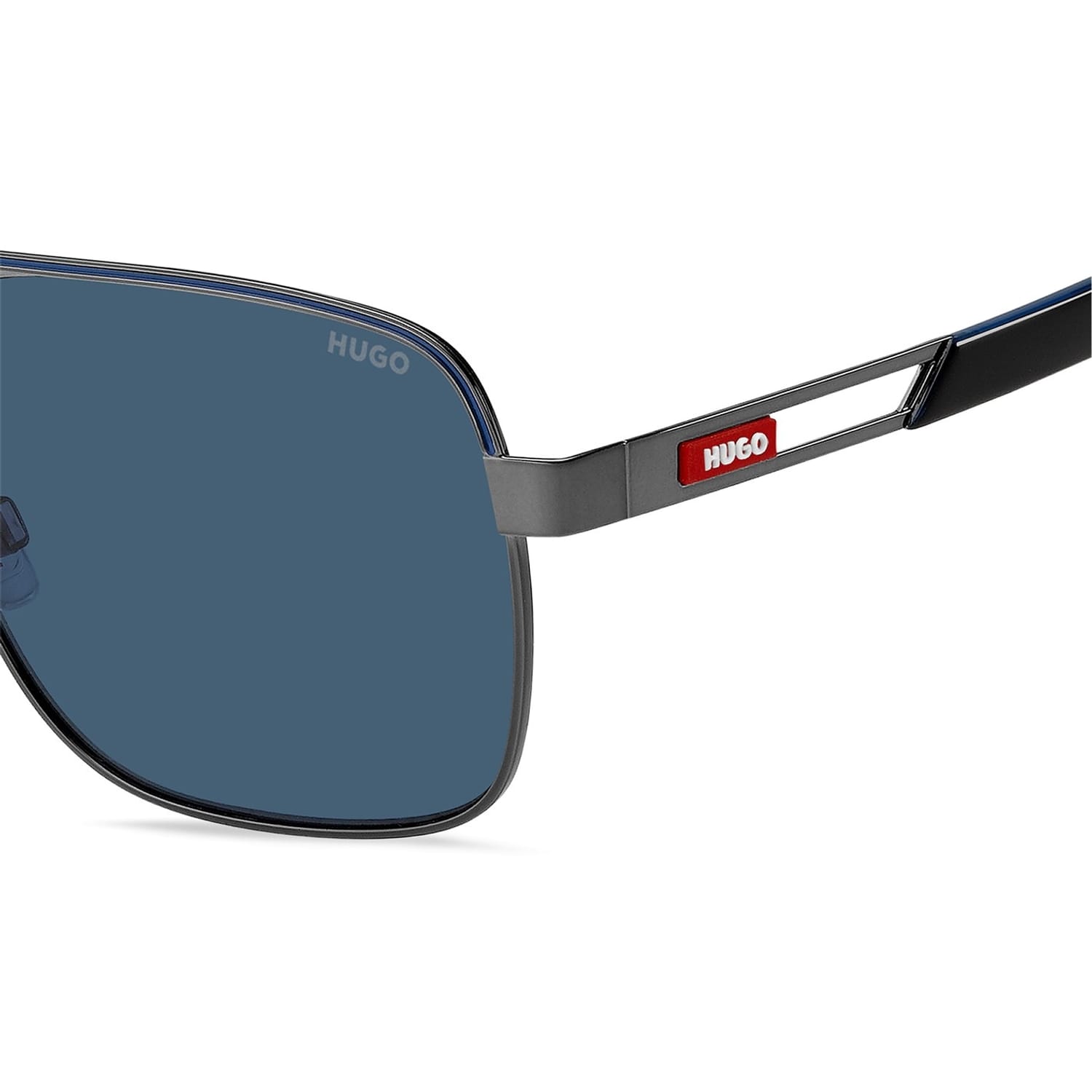 Hugo sunglasses feature a square frame style crafted from durable metal, offering a sleek and modern look. The full rim design is complemented by a distinctive double bridge, ensuring both style and comfort. These sunglasses are adorned with a subtle logo embellishment, adding a touch of brand identity to the overall aesthetic. -