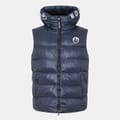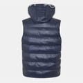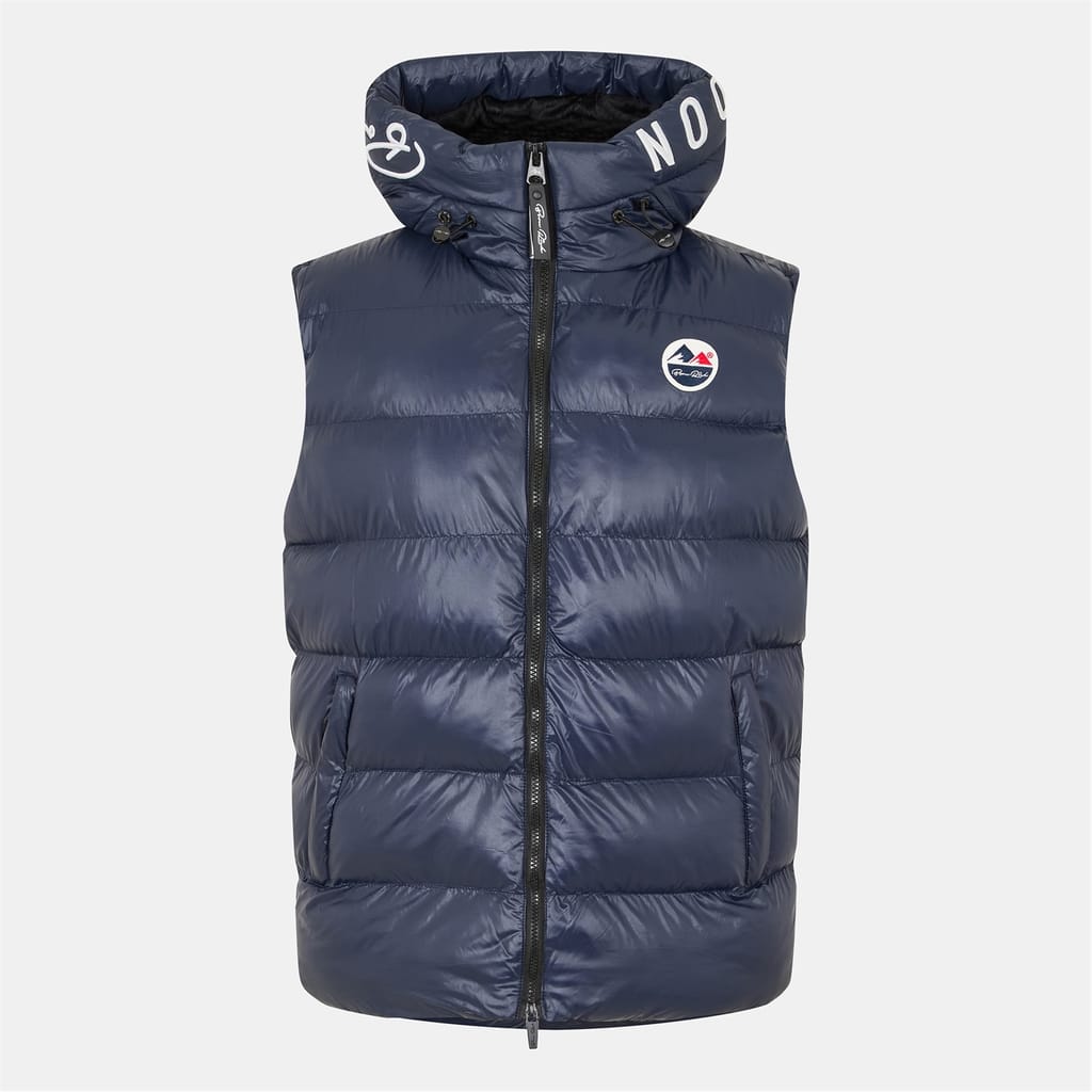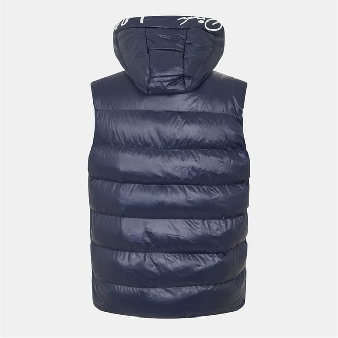 Born Rich presents a lightweight gilet with a high collar and a hooded neckline. This short, regular fit piece features a solid pattern and a straight hem. It includes a zipper closure and practical pockets, including zipped pockets, for added convenience. The design is completed with a subtle logo embellishment, making it a versatile addition to your wardrobe. -