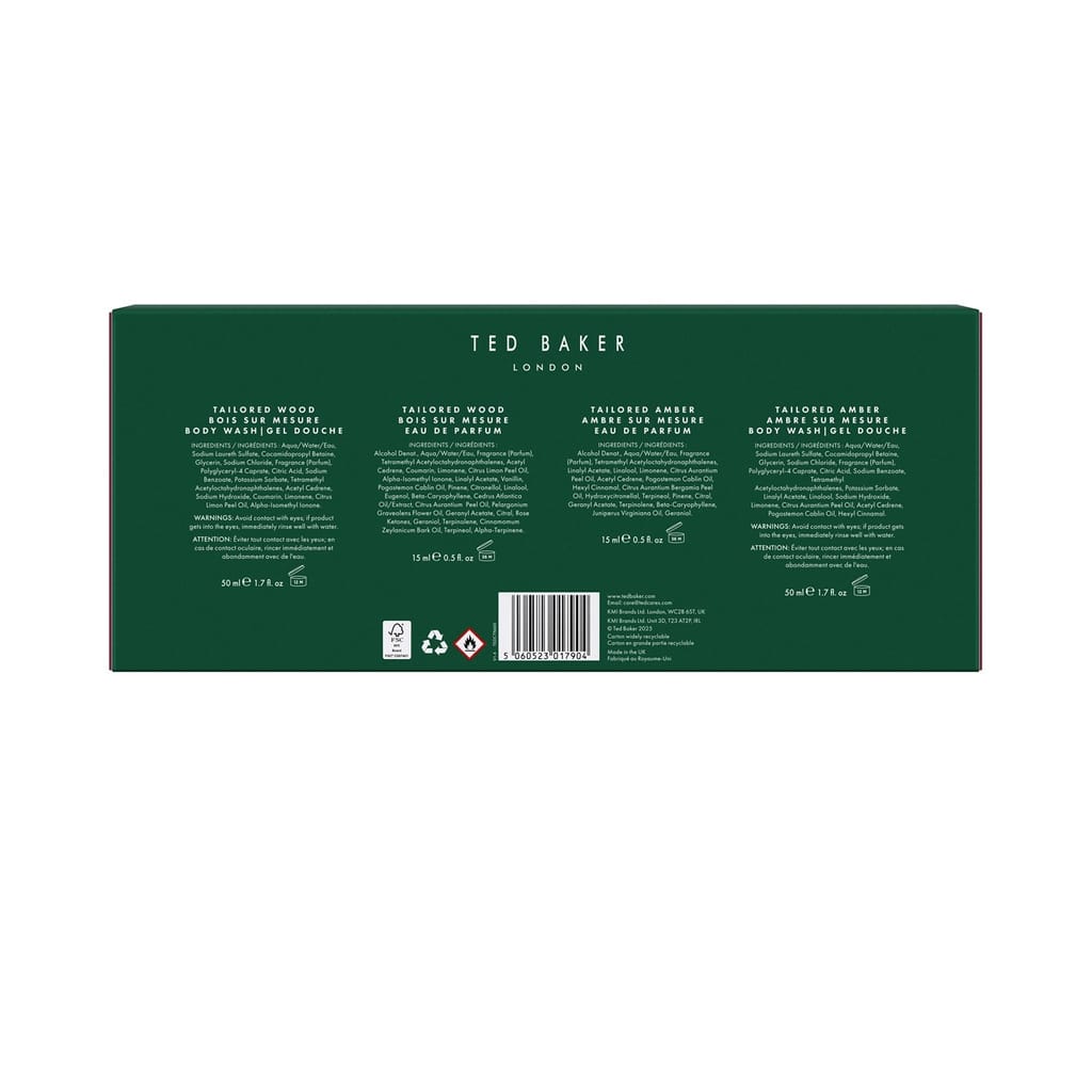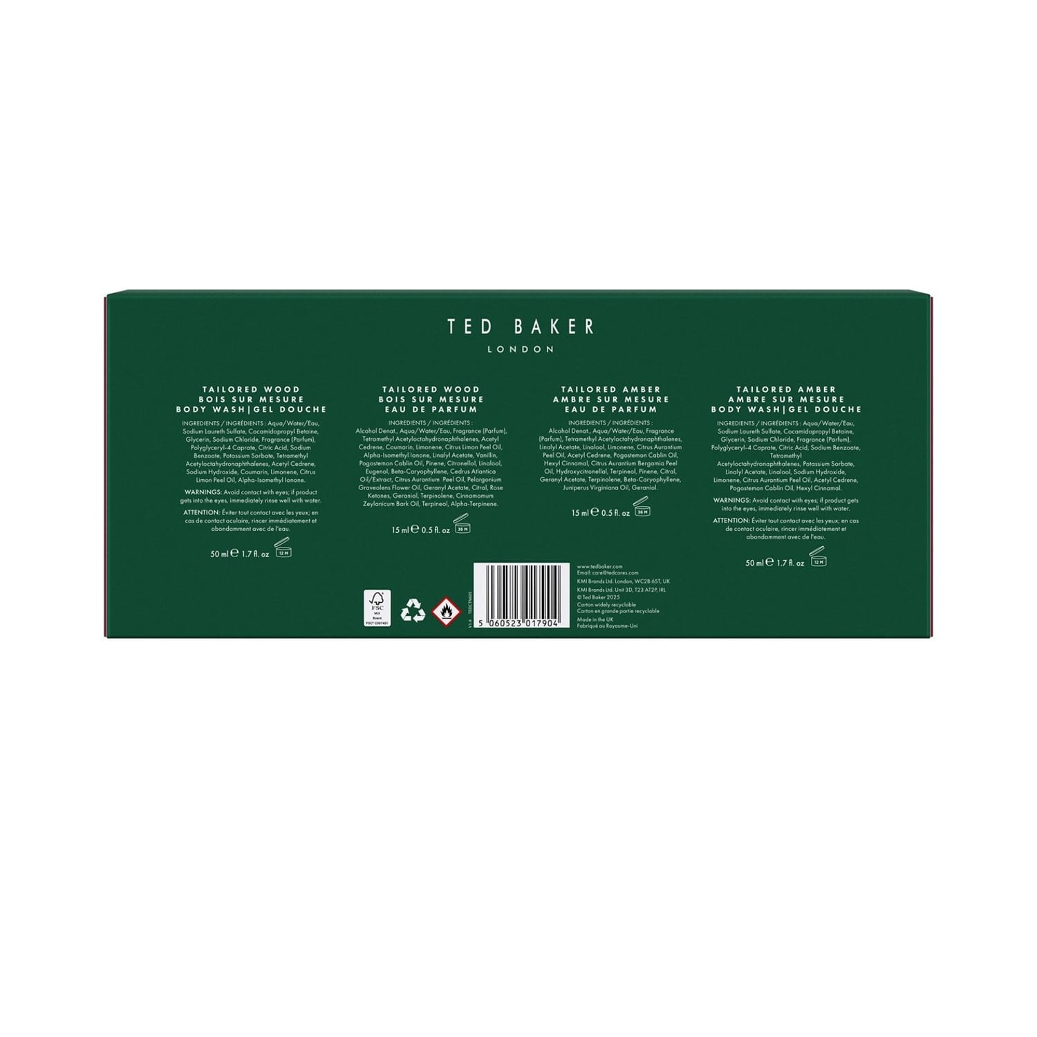 Ted Baker quad gift set contains 50ml Body wash in Tailored wood and Tailored Amber with mini eau de toilette to match -
