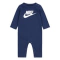 Nike presents a stylish romper featuring a crew neck and long plain sleeves. This regular fit piece is designed with a snap closure for convenience. The standout feature is the logo print embellishment, adding a touch of brand identity to the overall design. -