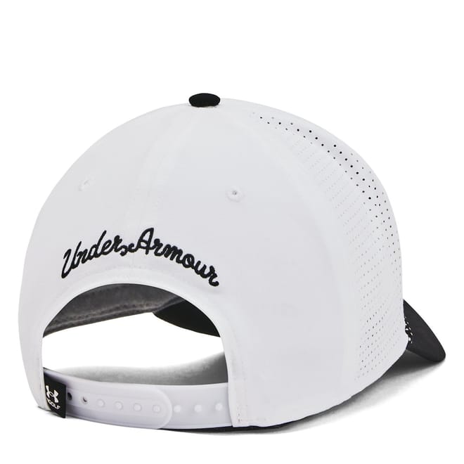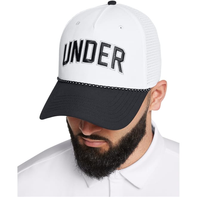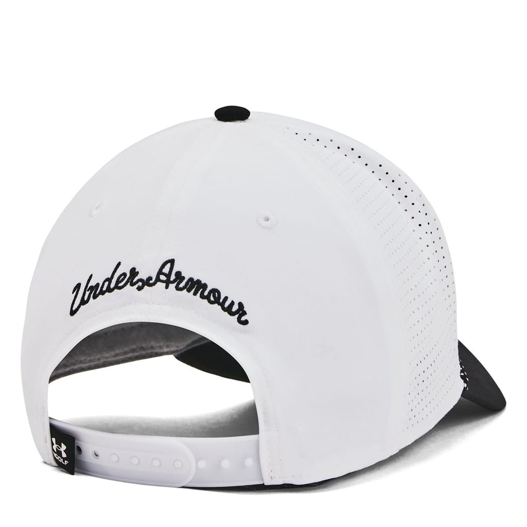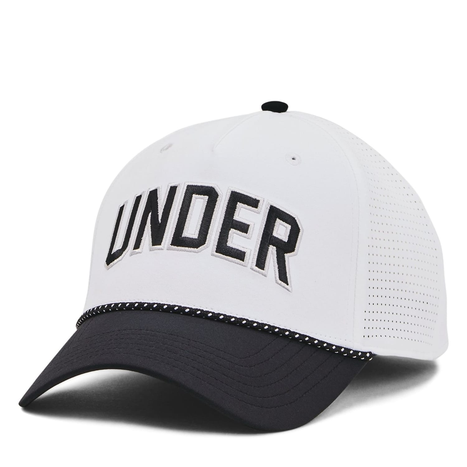 The Under Armour snapback cap is a stylish choice for sporting activities. Featuring a snap-back closure for a secure fit, this cap showcases embroidered arch lettering and a logo, adding a touch of detail. The cap's design is completed with stitched embellishments, making it a versatile accessory for any casual outing. -