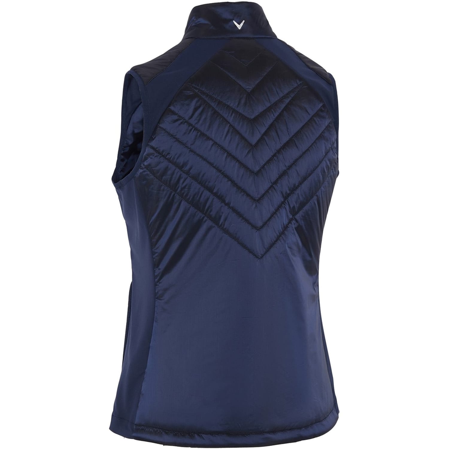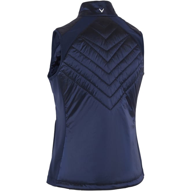 The Callaway performance gilet features a high collar and a regular fit, offering a sleek silhouette. This short waist coat is designed with a chevron pattern and a straight hem. It includes a full zipper closure and practical zipped pockets with stitched details, making it a functional choice for those seeking style and utility. -