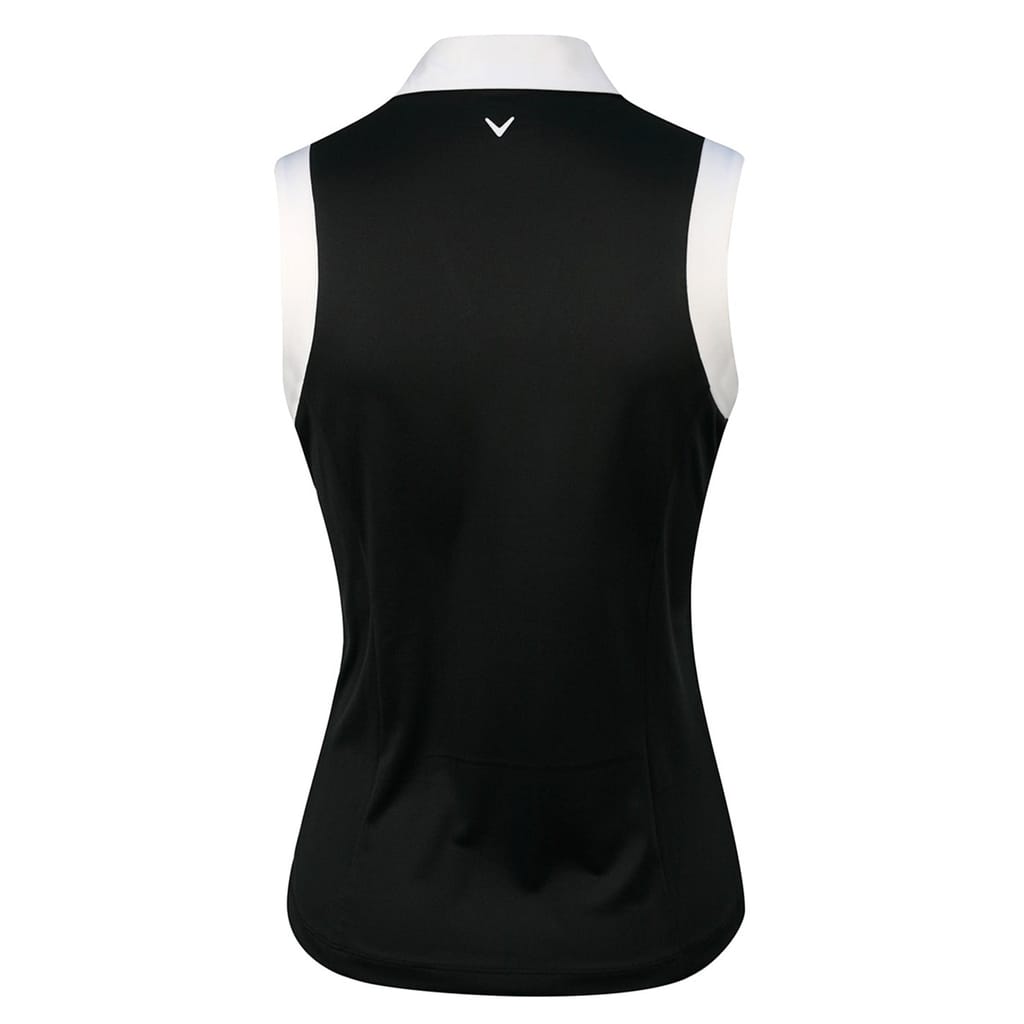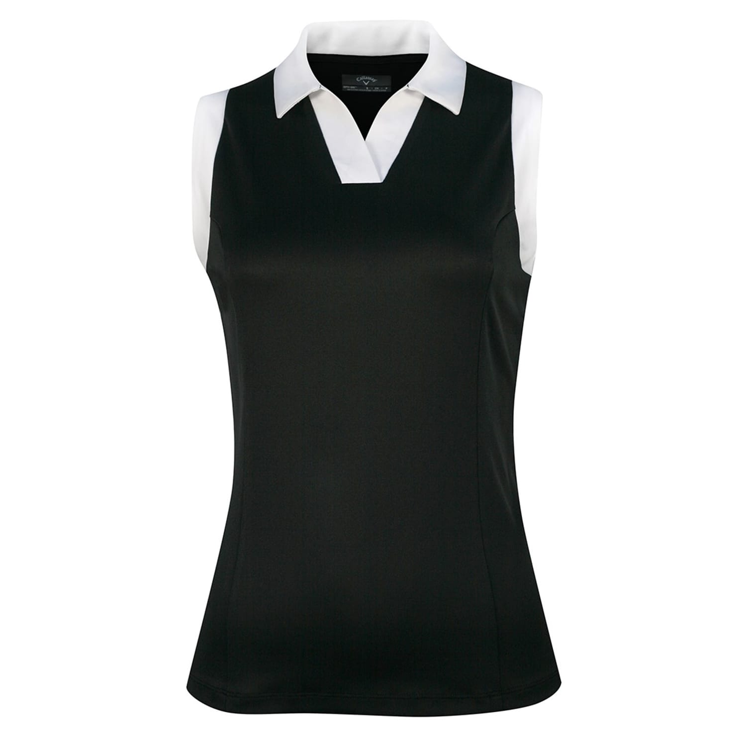 This Callaway top is designed for performance with a solid pattern and a polo collar. It features a sleeveless design and offers a regular fit, making it a versatile choice for various activities. -
