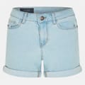 Noisy May solid bermuda shorts offer a slim fit, perfect for casual collections. These jean shorts feature a zip fly and front button closure, complemented by belt loops. Embellished with multiple pockets, including front, back, and coin pockets, along with detailed stitching and a button placket, these shorts are both functional and stylish. -