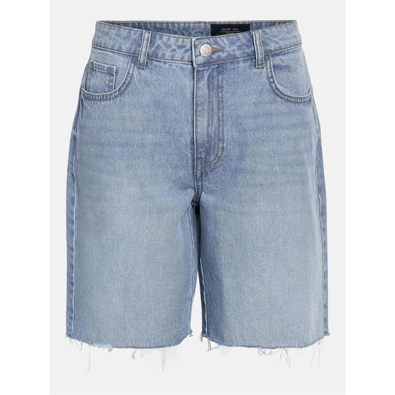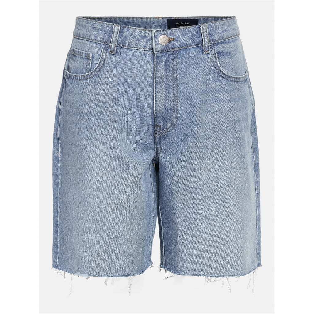 Noisy May presents these stylish stone wash jean shorts, perfect for a casual look. Featuring a zip fly and front button closure, these Bermuda shorts come with practical belt loops. The design includes multiple pockets, such as front, back, and coin pockets, along with a distressed hem and detailed stitching, making them a versatile addition to your wardrobe. -