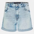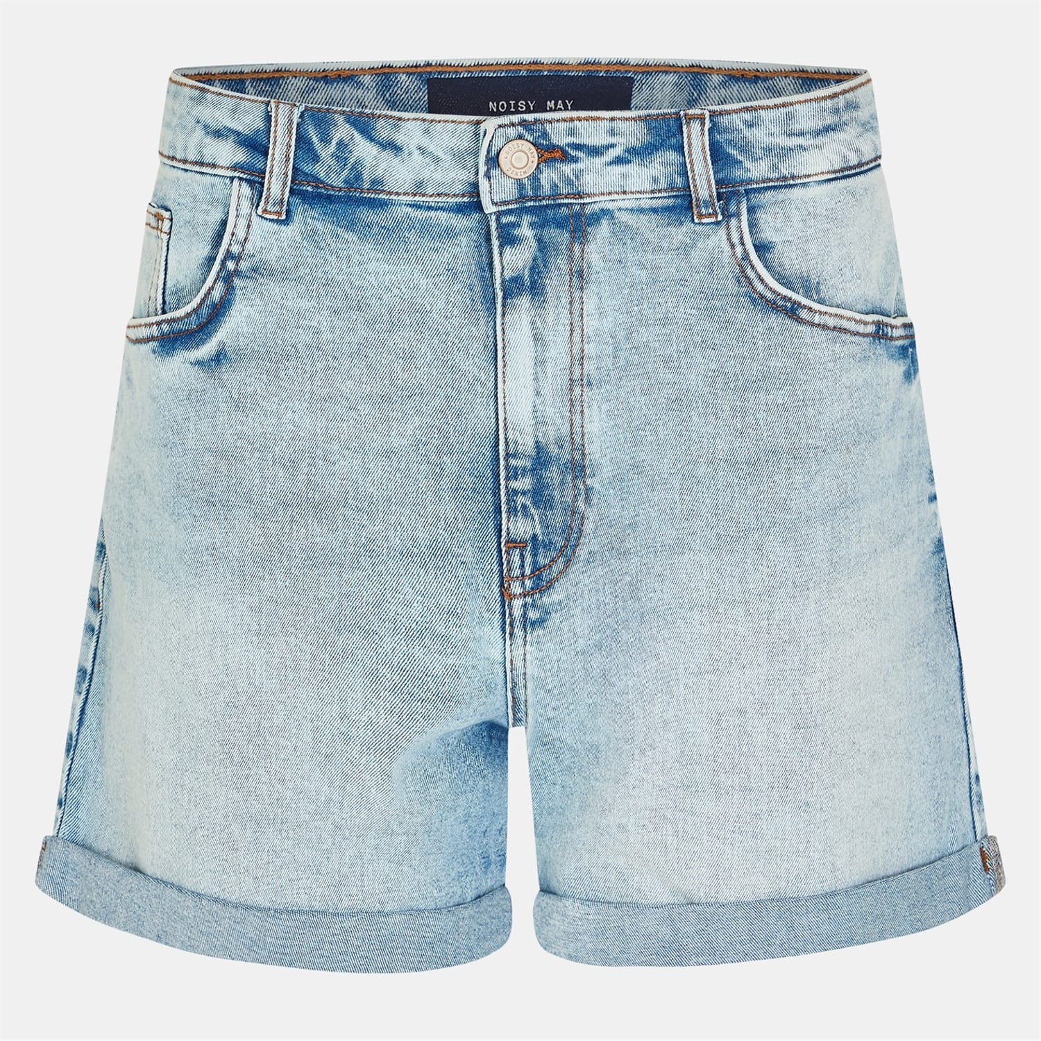 Noisy May stone wash jean shorts offer a casual style perfect for relaxed days. These bermuda shorts feature a zip fly, front button, and belt loops for a secure fit. Embellished with multiple pockets, including front, coin, and back pockets, along with detailed stitching, they provide both functionality and style. Ideal for those seeking a laid-back yet trendy look. -