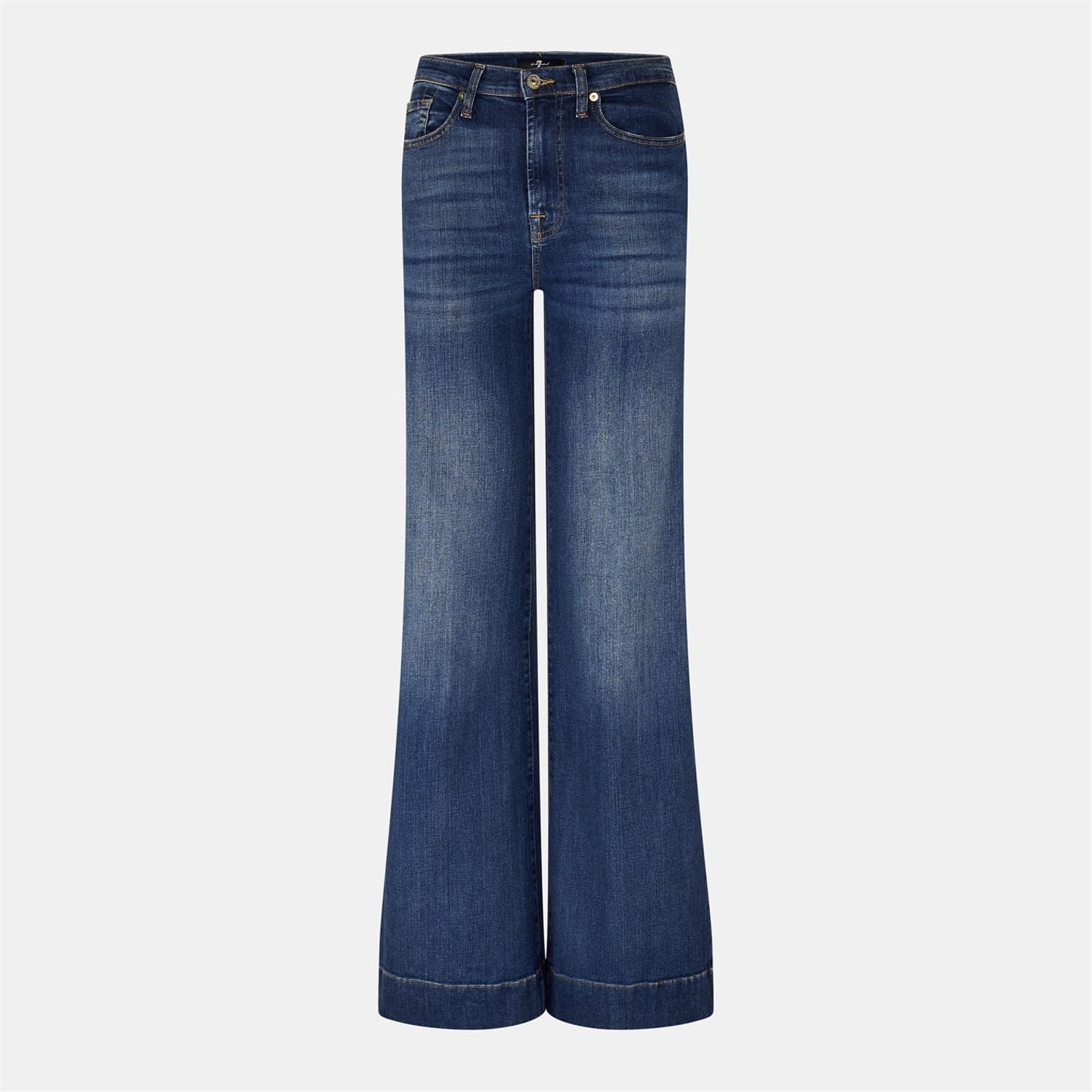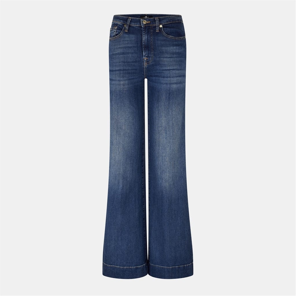 Discover the 7 for all mankind jeans, featuring a five-pocket design and a wide leg cut. These jeans offer a wide fit and are crafted with a stylish wash pattern. The design includes practical elements such as a zip fly, front button, and belt loops, along with detailed stitching. The jeans are complete with front, back, and coin pockets for added functionality. -