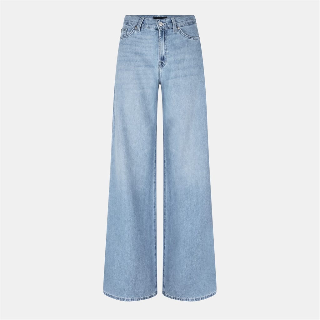 Discover the 7 for all mankind wide-leg jeans, featuring a light wash and wide fit. These jeans come with a zip fly, front button, and belt loops for a secure fit. Embellished with pockets, stitching, rivets, and a waist patch, they offer both style and functionality. The wide-leg cut adds a modern touch to this classic piece. -