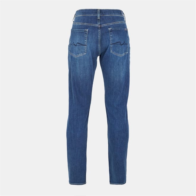 Discover the timeless appeal of 7 for all mankind jeans, featuring a straight fit and a classic five-pocket design. These jeans boast a zip fly, front button, and belt loops for a secure fit. The wash pattern adds a touch of character, while the detailed stitching and multiple pockets, including a coin pocket and two back pockets, offer both style and functionality. -