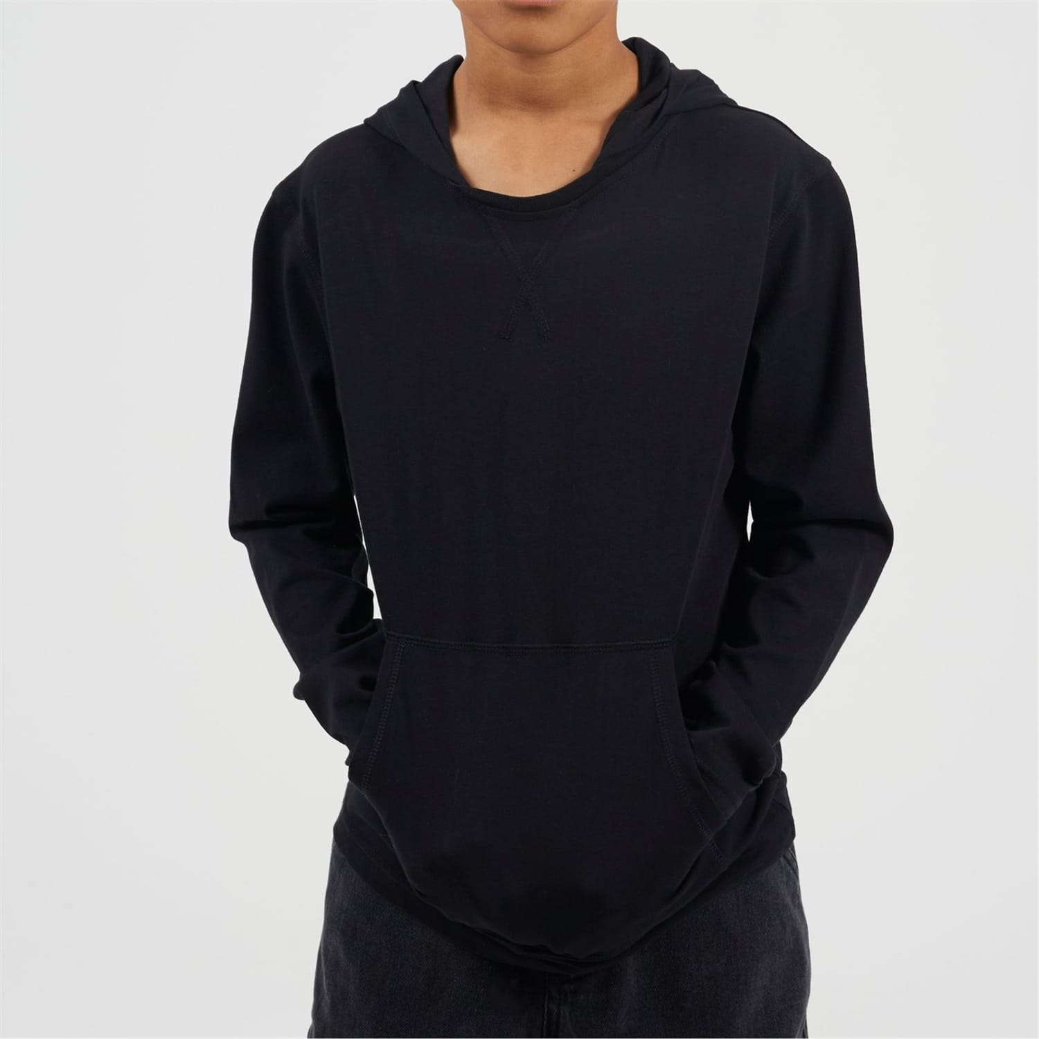 Brave Soul Boy's Hoodie. Long set in style sleeve, crossover neck stitch detail. Fixed hood, front kangaroo pocket, solid colourway. -