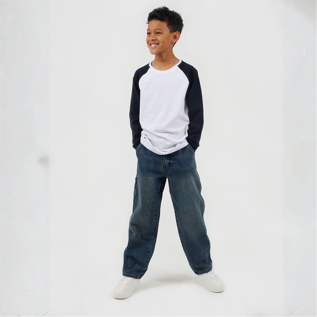 Brave Soul Boys Tee. Long sleeve, crew neck with modesty V front. Contrast colour raglan style sleeves, ribbed neck. -