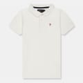 This Farah top features a classic polo collar and a front button closure, offering a regular fit. The short sleeves and solid pattern provide a timeless look, while the embroidered detail adds a touch of sophistication. -