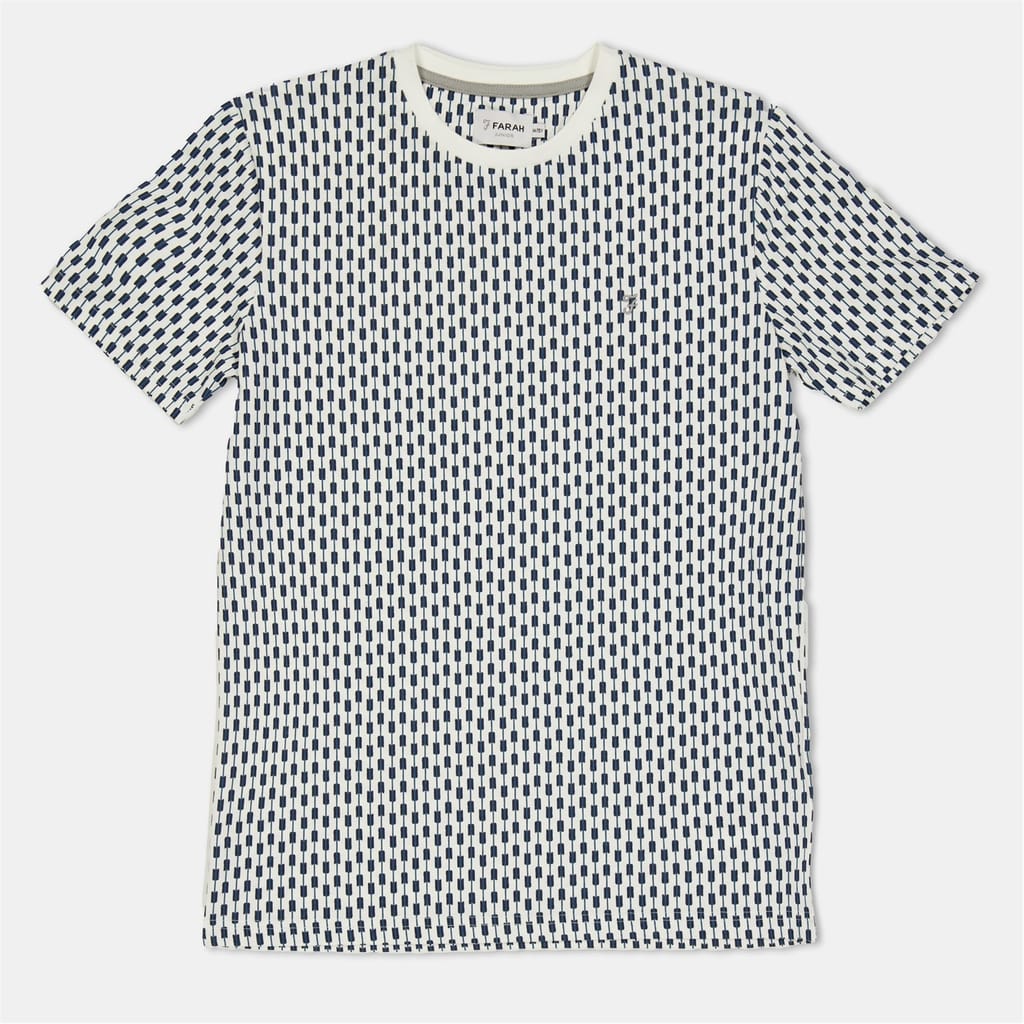 This Farah top features a geometric print with a regular fit, offering a stylish yet comfortable choice. The short sleeves and crew neck design provide a classic look, while the straight hem adds a neat finish. An embroidered detail enhances its appeal, making it a versatile addition to your wardrobe. -