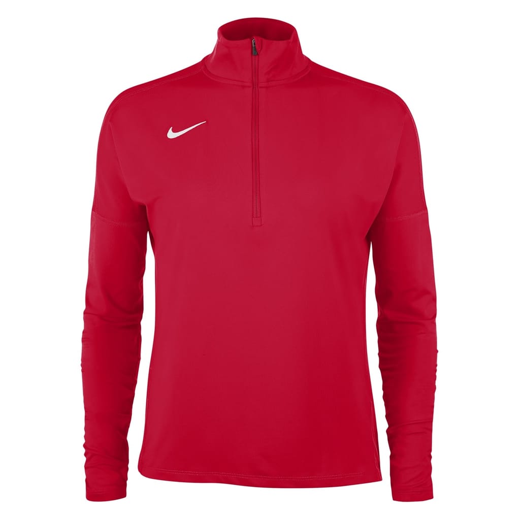 This Nike top is designed for performance with a regular fit and long sleeves. It features a high collar and a zip neck for added style and functionality. The solid pattern is complemented by a straight hem and fitted cuffs. Embellished with a logo and a front zipper pocket, this top combines practicality with a sleek design. -
