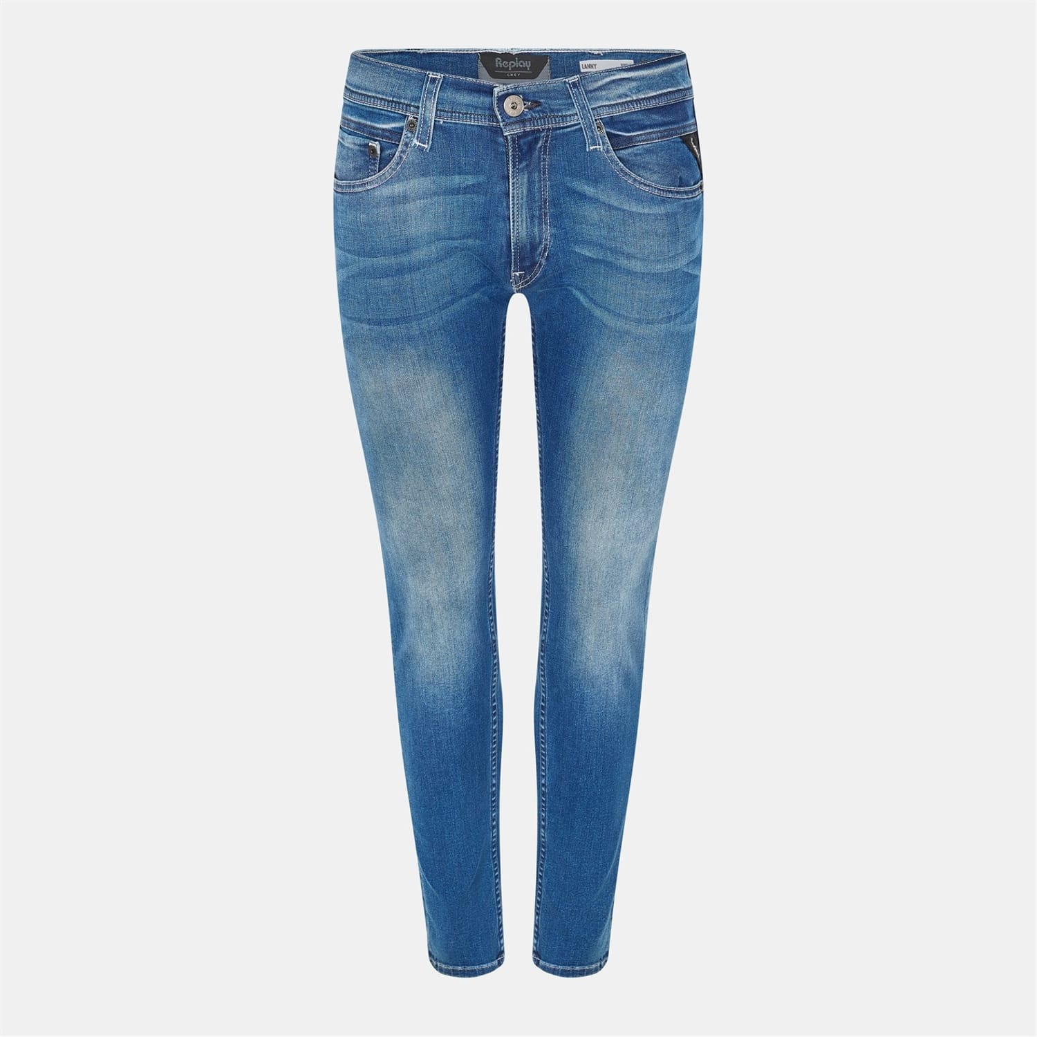 Replay's five-pocket design jeans feature a skinny fit and a stylish wash pattern. The jeans are equipped with a zip fly, front button, and belt loops for a secure fit. Embellished with front, back, and coin pockets, along with stitching, rivets, and whiskers, these jeans offer both functionality and a modern look. -