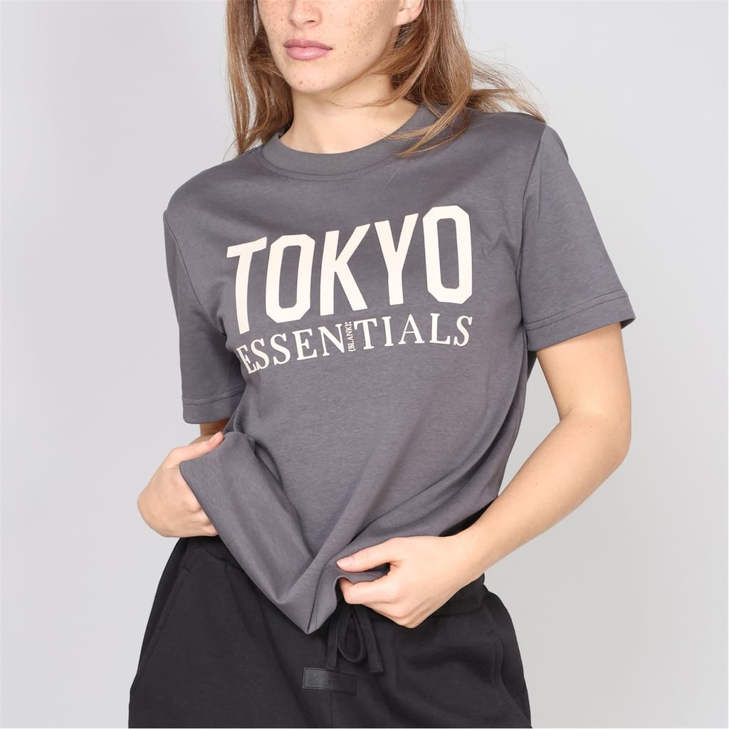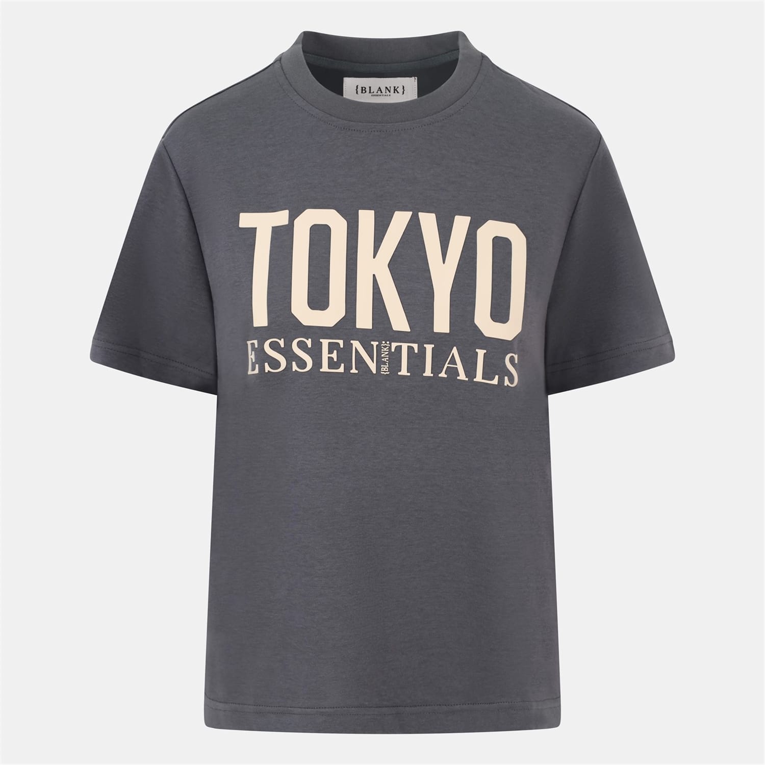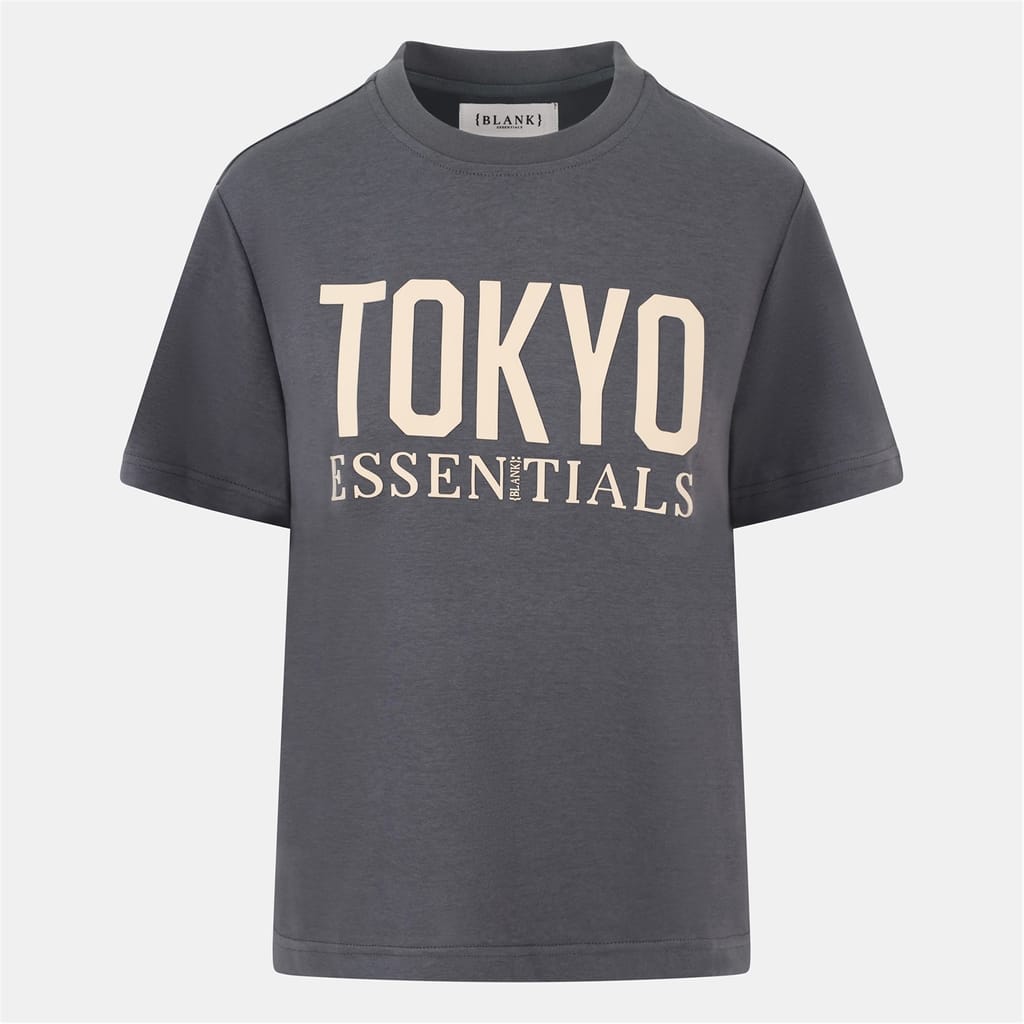 The Blank Essentials Tokyo top features an oversize fit with a crew neck and short sleeves. It showcases a logo print pattern, complemented by a ribbed collar and a straight hem. Part of the Essentials collection, this top offers a stylish and comfortable choice for casual wear. -