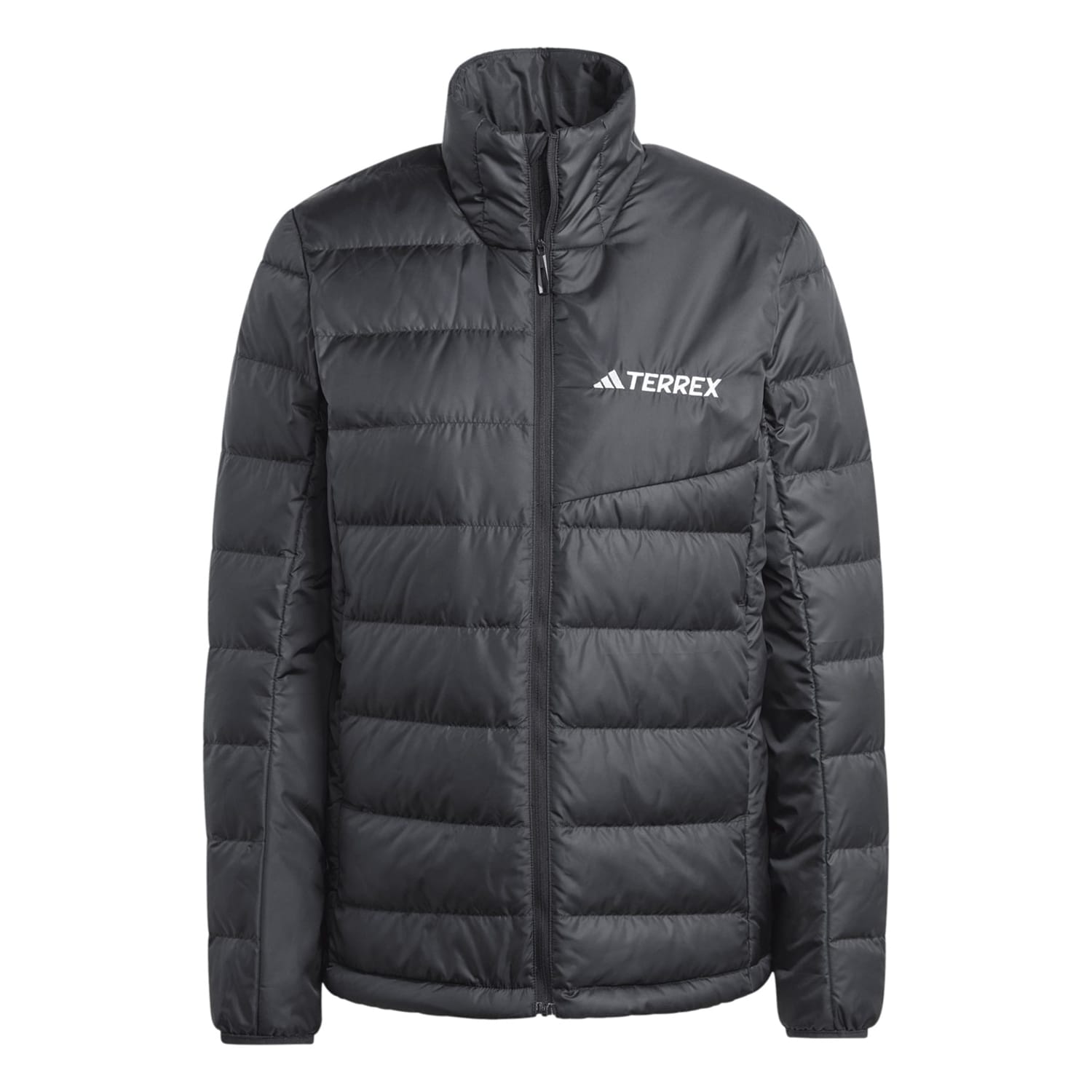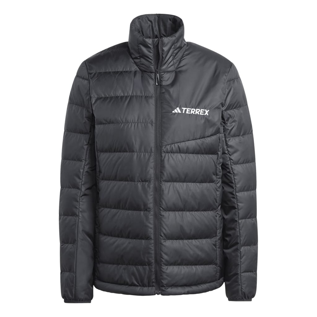 This adidas down jacket features a high collar and a regular fit, offering both style and comfort. The short length and straight hem provide a modern silhouette, while the elasticated cuffs ensure a snug fit. The jacket is equipped with a front zipper closure and practical zipped pockets. A subtle logo embellishment adds a touch of brand identity to this solid-patterned piece. -