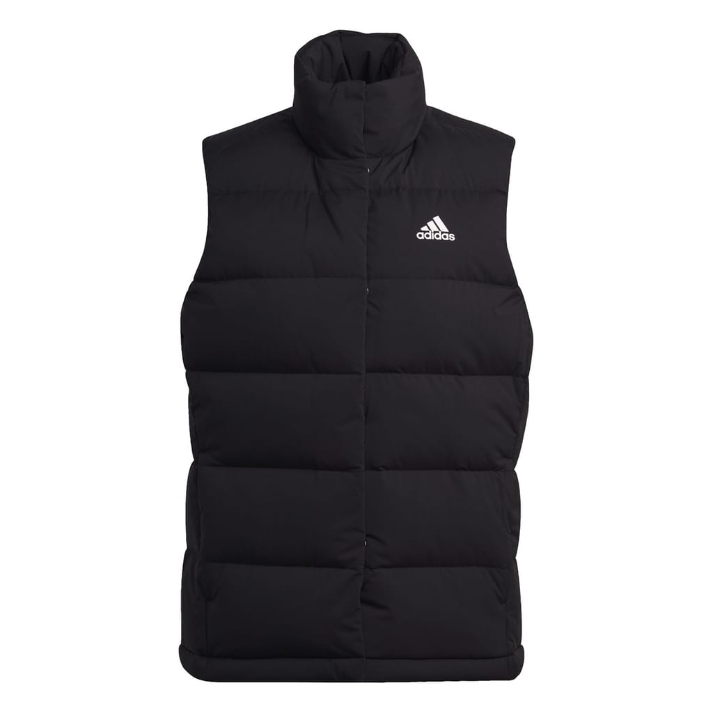 This adidas gilet is a lightweight, regular fit piece with a high collar and straight hem. The short length and solid pattern offer a sleek look, while the logo embellishment adds a touch of brand identity. Ideal for those seeking a versatile and stylish addition to their wardrobe. -