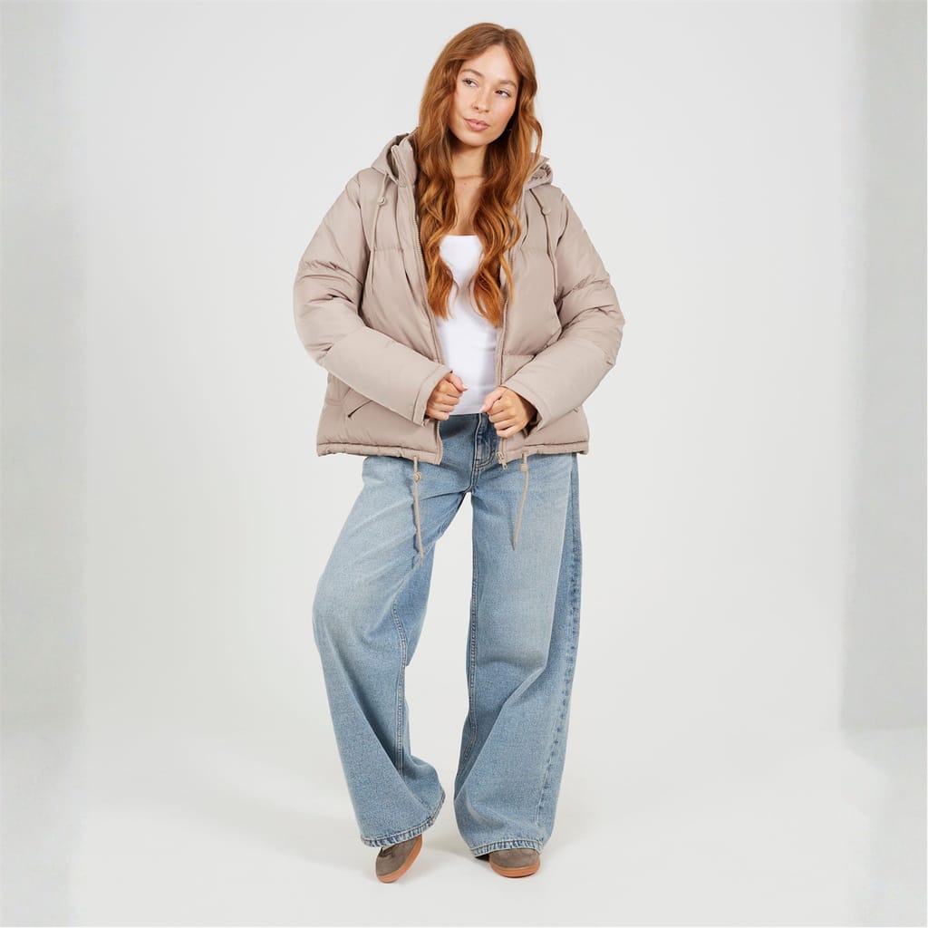 Brave Soul Women's jacket. Puffer style, short length, all over padding. Fixed hood with adjustable drawcord. Drawcord hem with toggles, two lower pockets with flaps. -