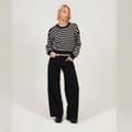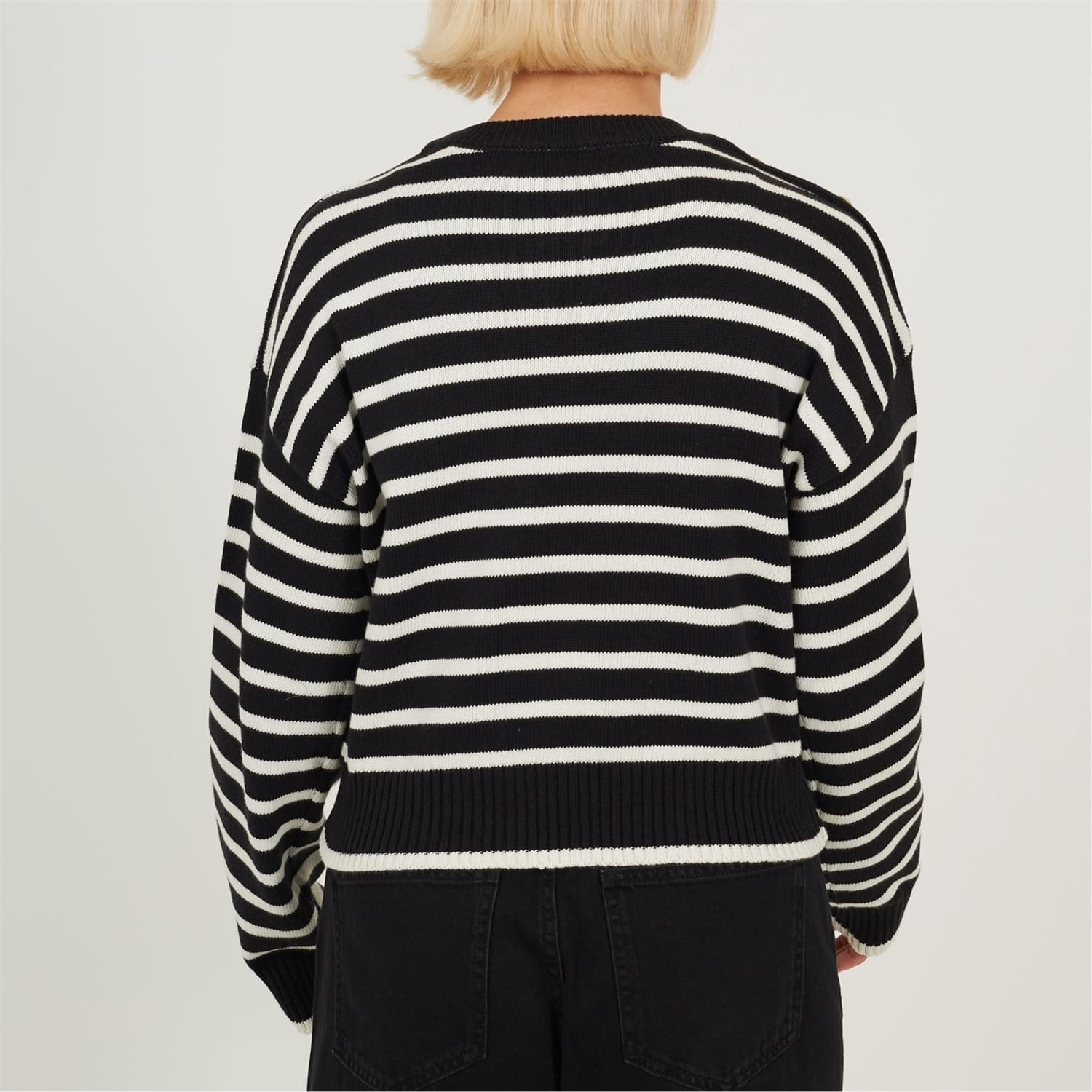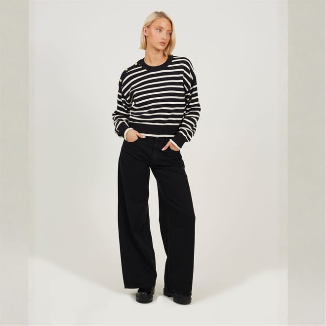 Brave Soul Women's Jumper. Crew neck, boxy shape with dropped shouler. Long sleeve with ribbed cuffs, all over stripe. Ribbed neck and hem, gold button detail to shoulder. -