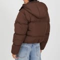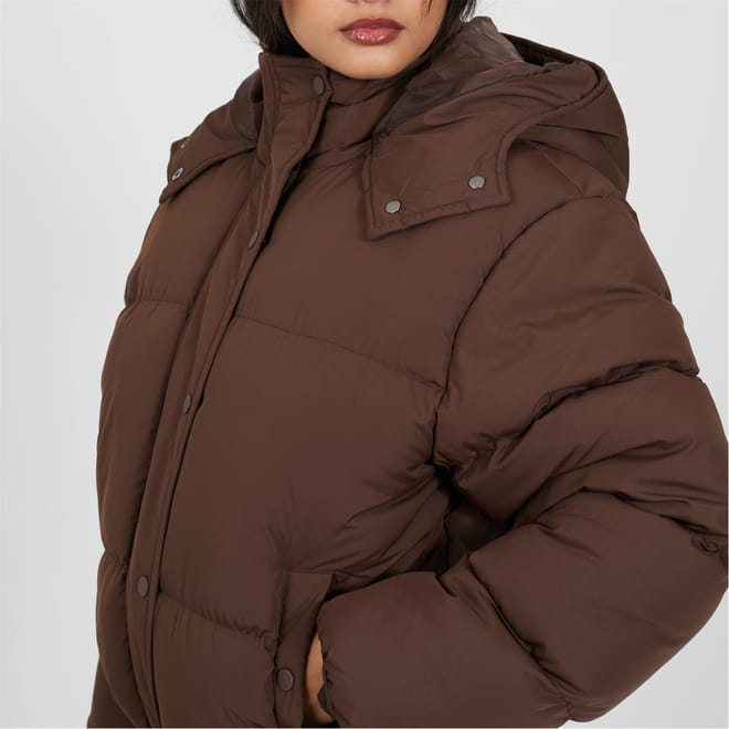 Brave Soul women's puffer jacket. An oversized puffer with fixed hood, elasticated hem and cuffs. Two welt pockets, zip fastening with popper overlay. -