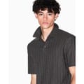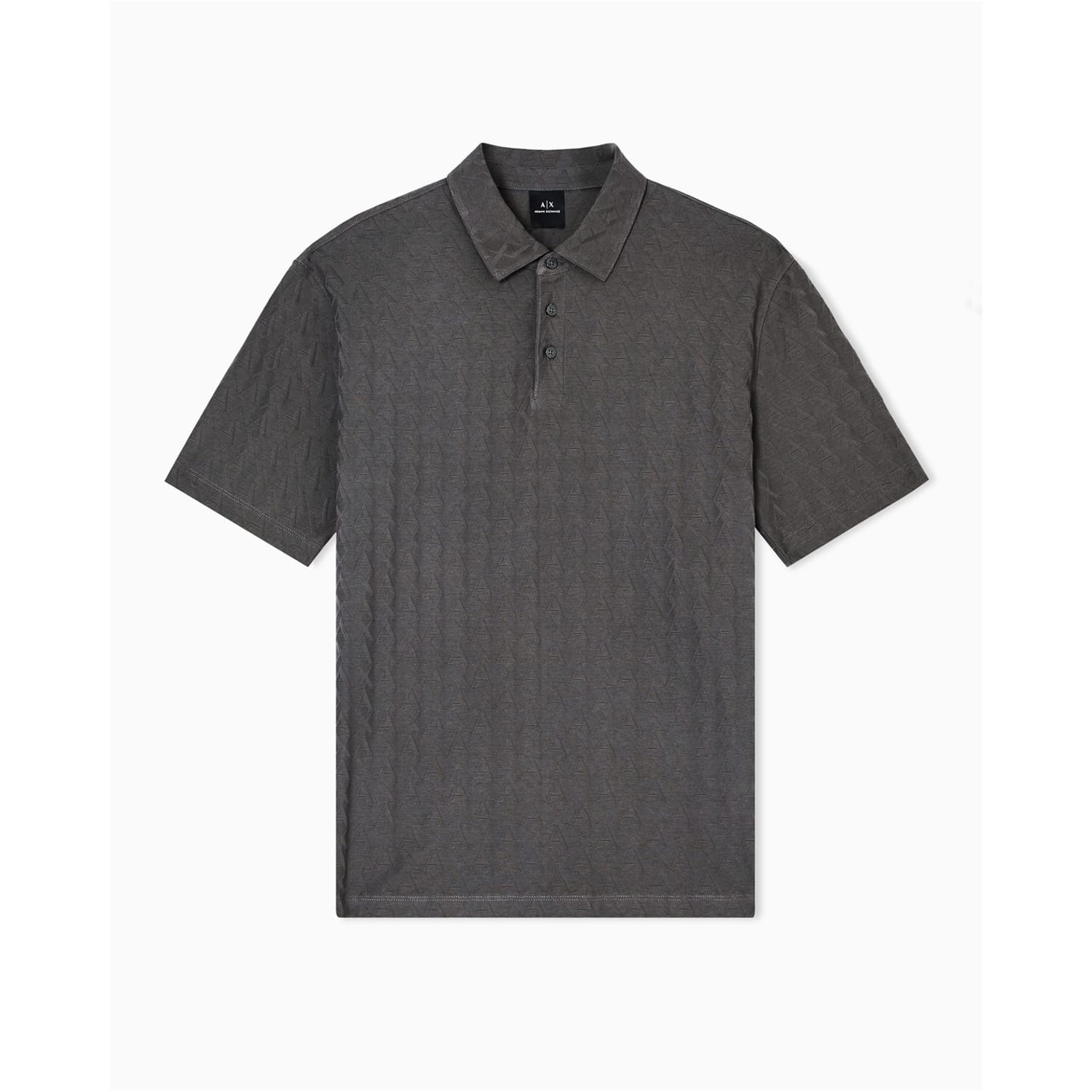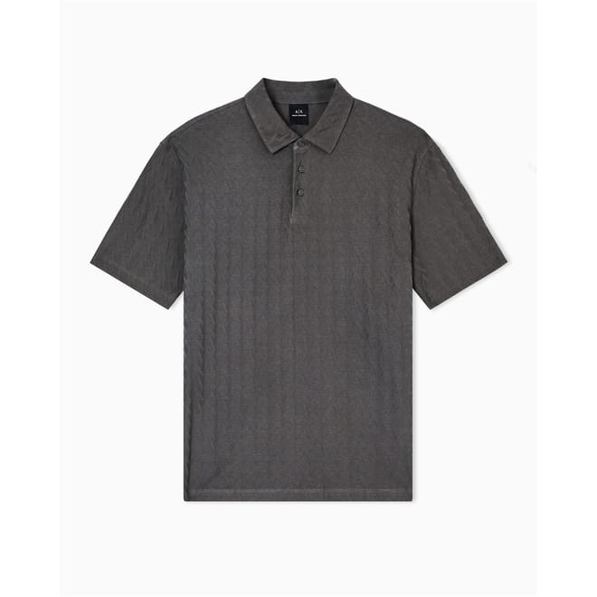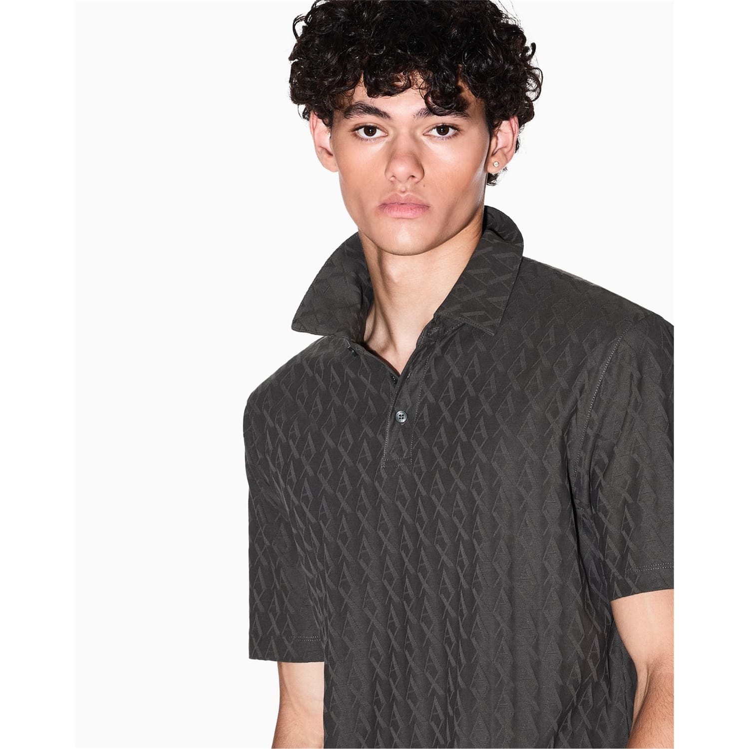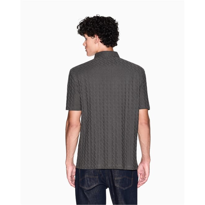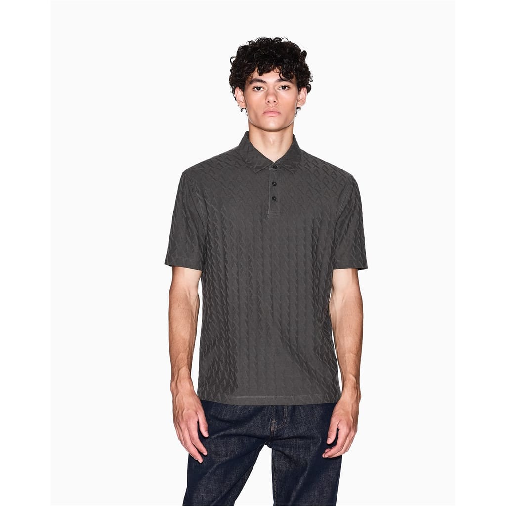 This Armani Exchange top is a casual staple featuring a geometric pattern and a polo collar. Designed with short sleeves and a regular fit, it offers a comfortable and stylish look. The button closure adds a touch of practicality to this versatile piece. -
