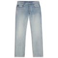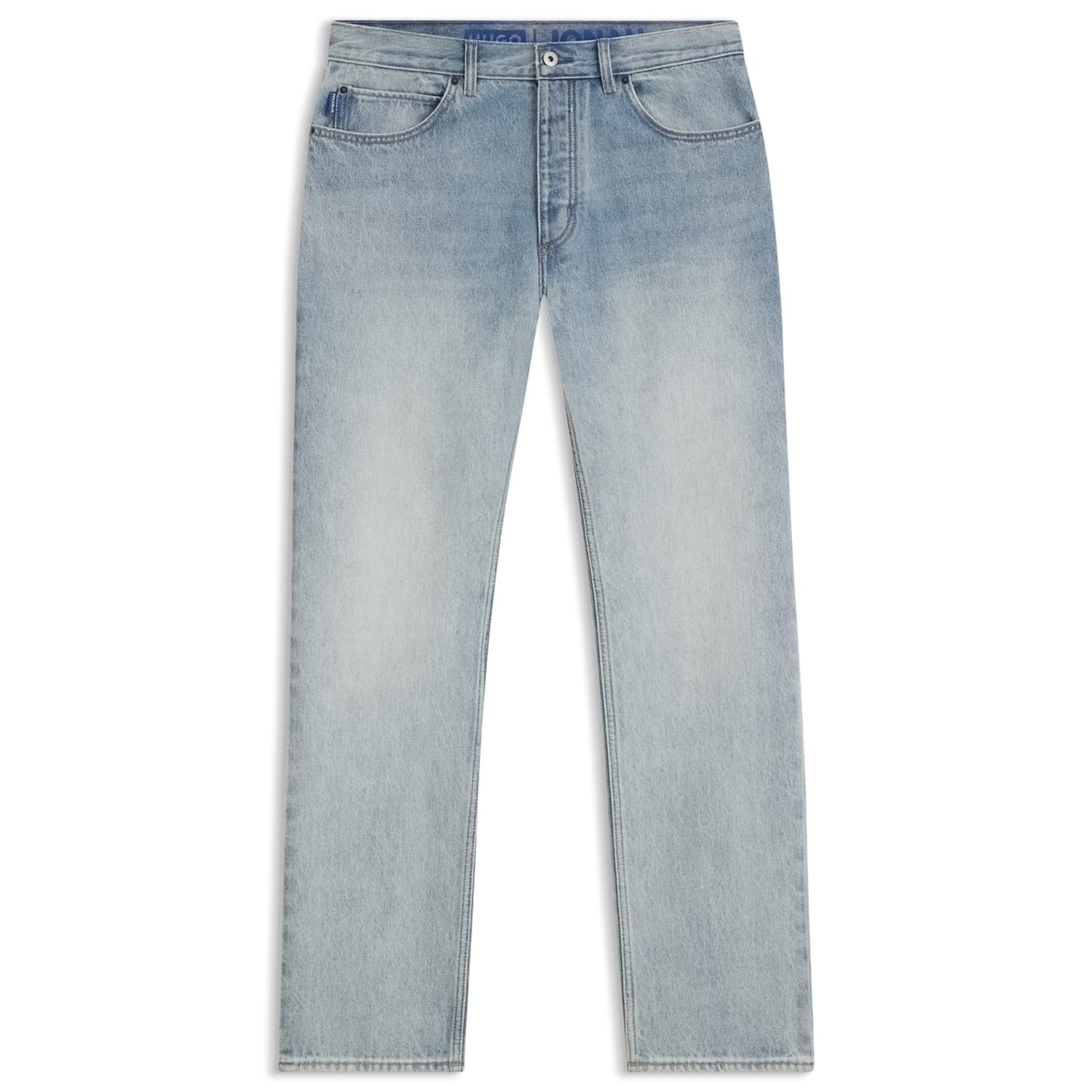 Hugo light wash jeans feature a slim fit and a classic five-pocket design. The jeans are equipped with a zip fly, front button, and belt loops for a secure fit. Embellished with front, back, and coin pockets, along with detailed stitching, these jeans offer both style and functionality. -