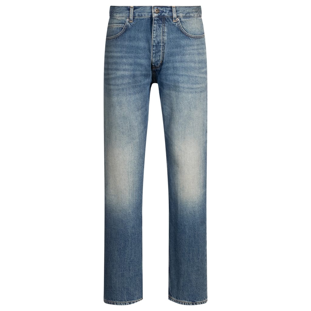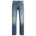 Discover the Hugo five-pocket design jeans, featuring a slim fit and a stylish wash pattern. These jeans come with a zip fly, front button, and belt loops for a secure fit. The design includes front, back, and coin pockets, enhanced by detailed stitching and whiskers for a modern touch. -