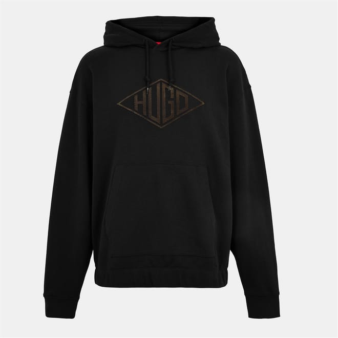 This Hugo top features a hooded neck and long sleeves with a drop shoulder design. It has an oversized fit and ribbed cuffs for added comfort. The top is embellished with a kangaroo pocket and an embroidered logo, complemented by a logo print pattern. A drawstring closure adds a practical touch to this stylish piece. -