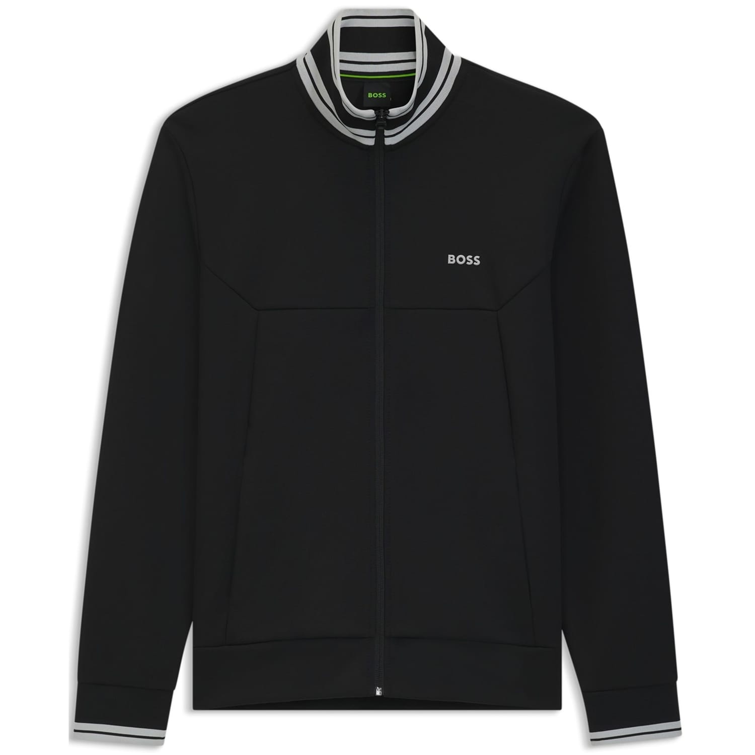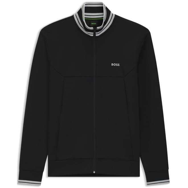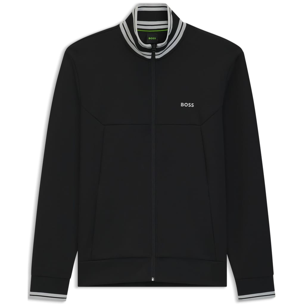 This Boss top features a mock neck and a bomber collar, offering a sleek and modern look. The long sleeves are complemented by ribbed cuffs, ensuring a comfortable fit. With a full zipper closure, this regular fit top is both practical and stylish. The solid pattern and straight hemline add to its timeless appeal. -