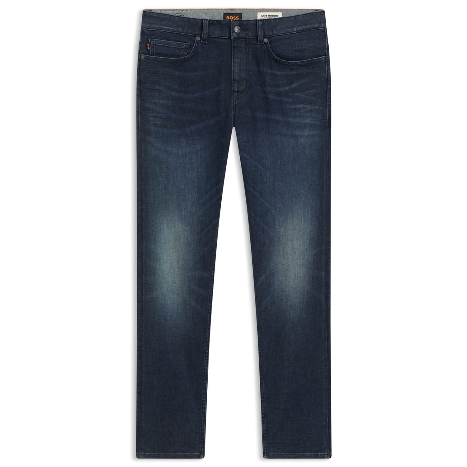 Boss Delaware jeans feature a slim fit and a classic five-pocket design. Crafted with a washed pattern, these jeans include a zip fly, front button, and belt loops for secure closure. Embellished with front, back, and coin pockets, along with stitching and rivets, they offer both style and functionality. -