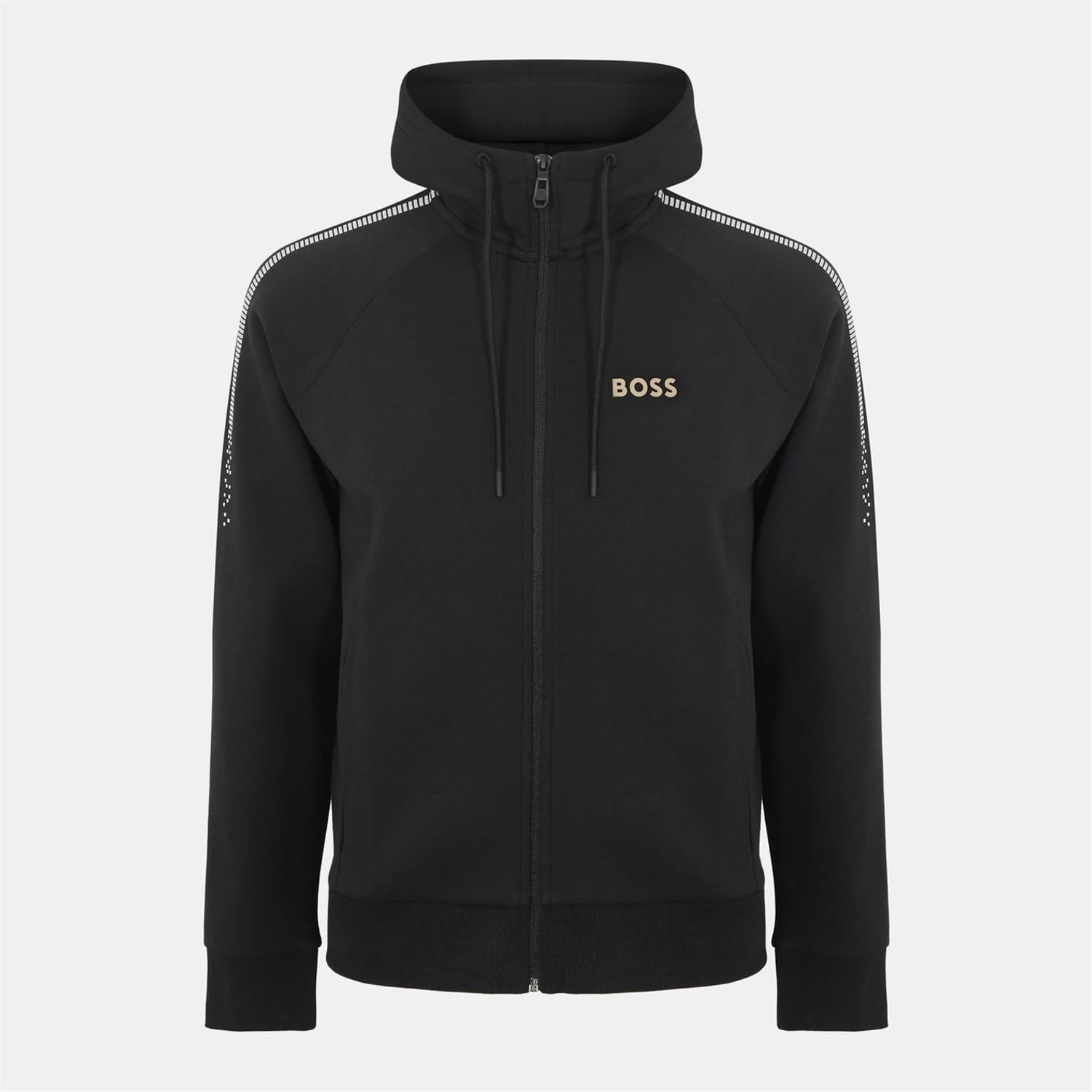 This Boss top features a long sleeve design with a zip neck and high collar, offering a regular fit. The raglan sleeves and ribbed cuffs add a touch of style, while the ribbed hem ensures a neat finish. The front logo and logo print pattern provide a distinctive look, complemented by a full zipper closure for convenience. -
