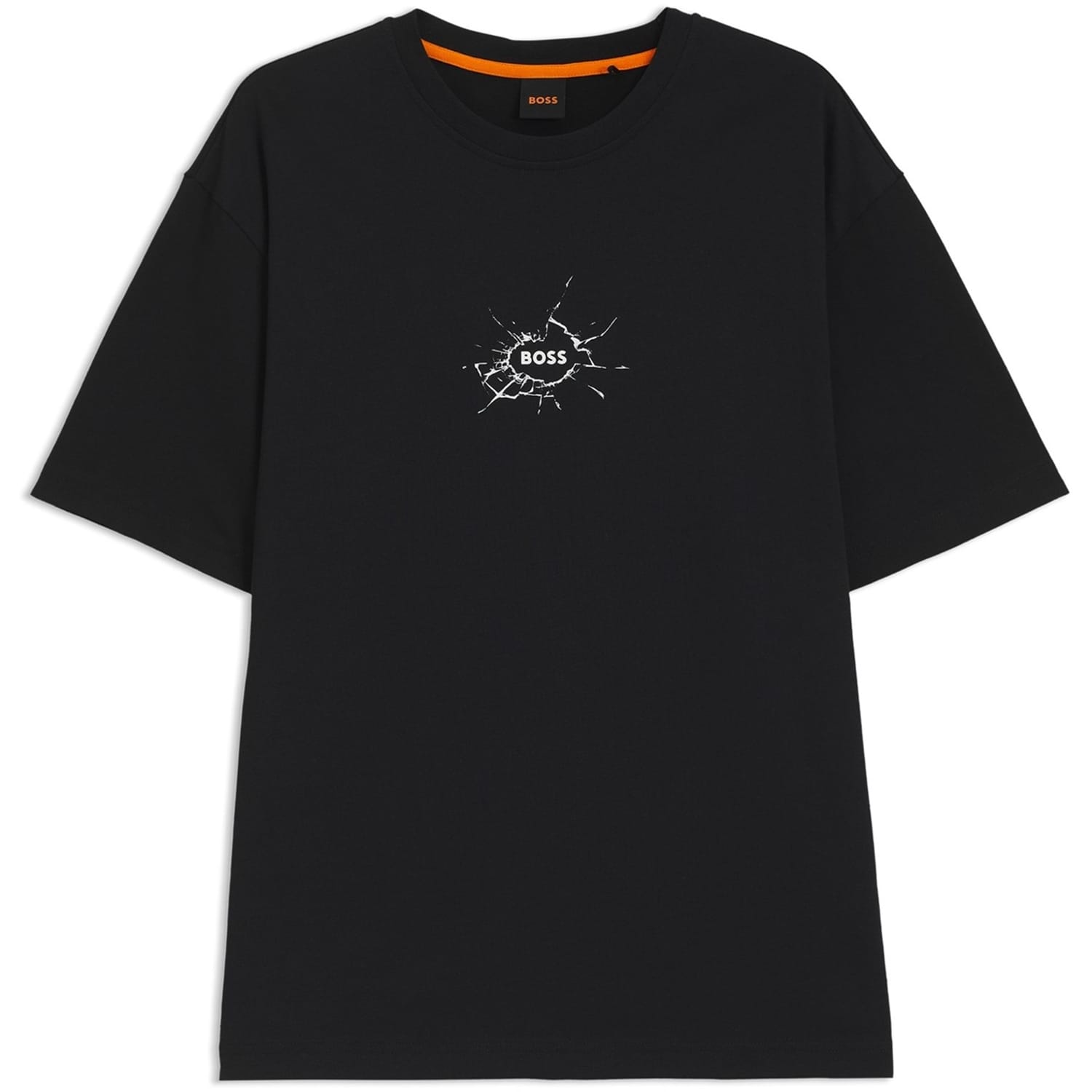 This Boss top from the Voyage collection features a crew neck and short sleeves with a drop shoulder design. It offers a regular fit and a straight hem. The top is adorned with a graphic print and logo embellishments, adding a stylish touch to your wardrobe. -