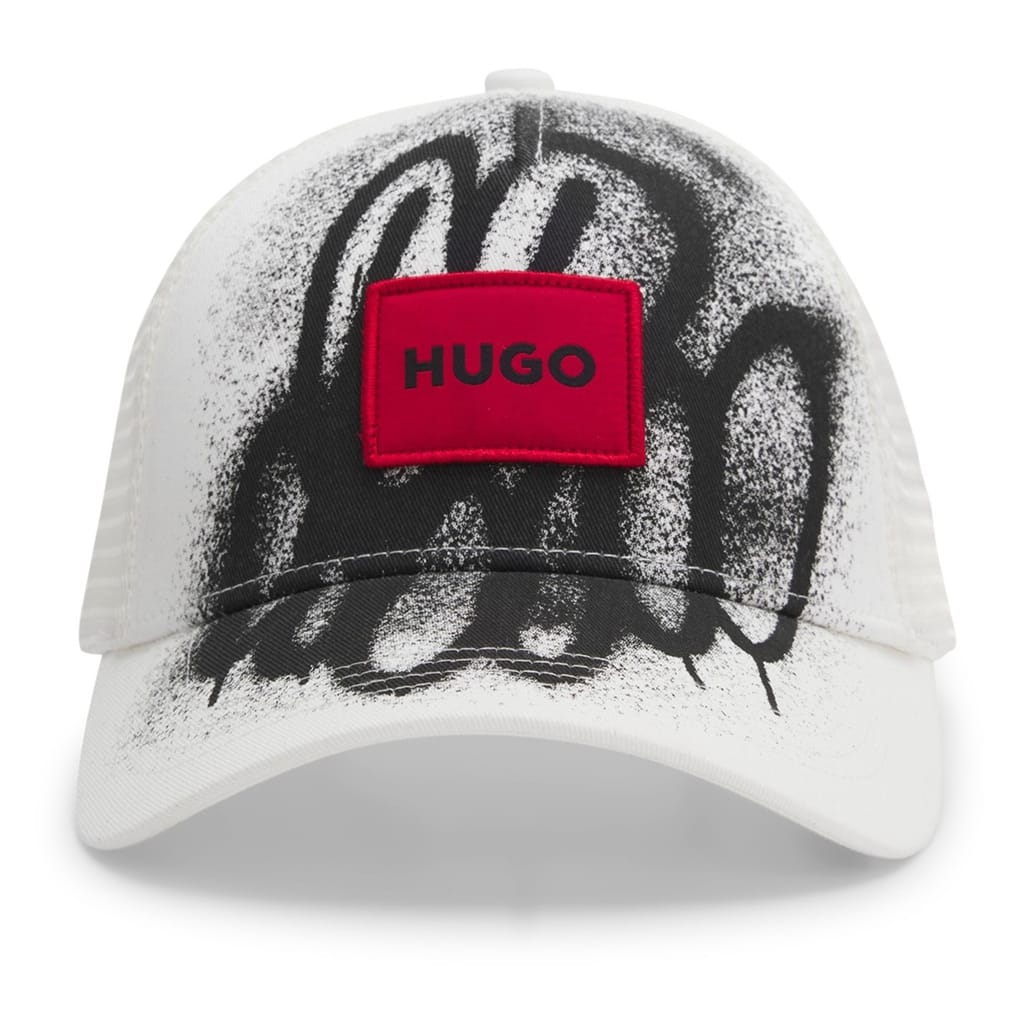 Discover the Hugo trucker cap, featuring a graffiti pattern and a distinctive logo patch. This stylish hat is designed with a snap-back closure for a comfortable fit. The cap's graphic print adds a modern touch, making it a standout accessory for any casual ensemble. -