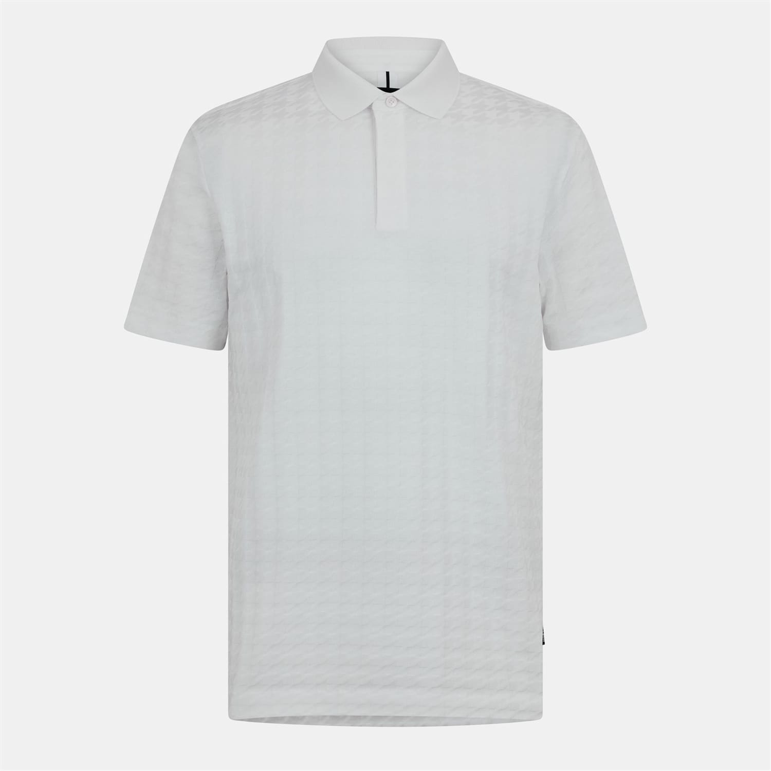 This Boss top features a classic houndstooth pattern, offering a timeless appeal. Designed with a polo collar and short sleeves, it provides a regular fit for comfortable wear. The front button closure adds a touch of sophistication, while the straight hem ensures a neat finish. -