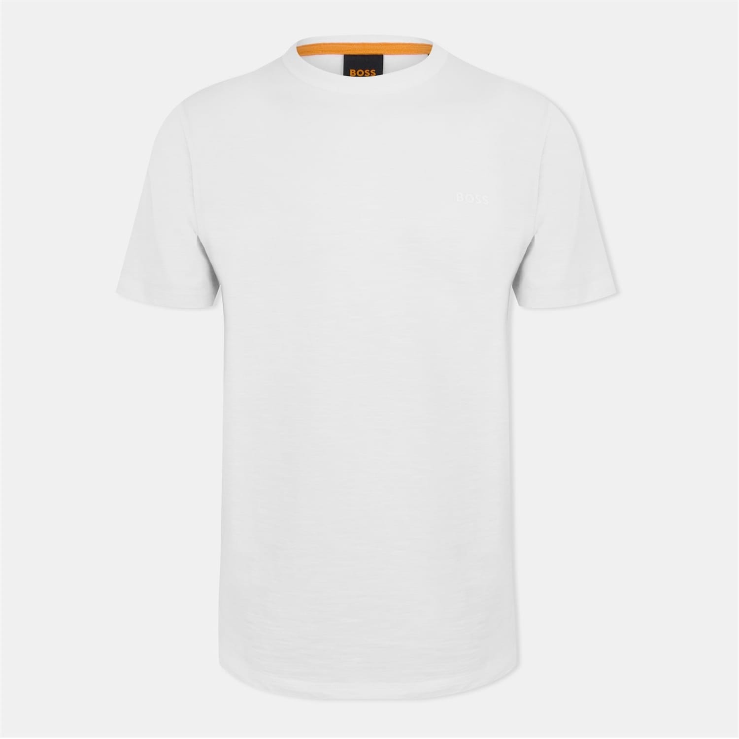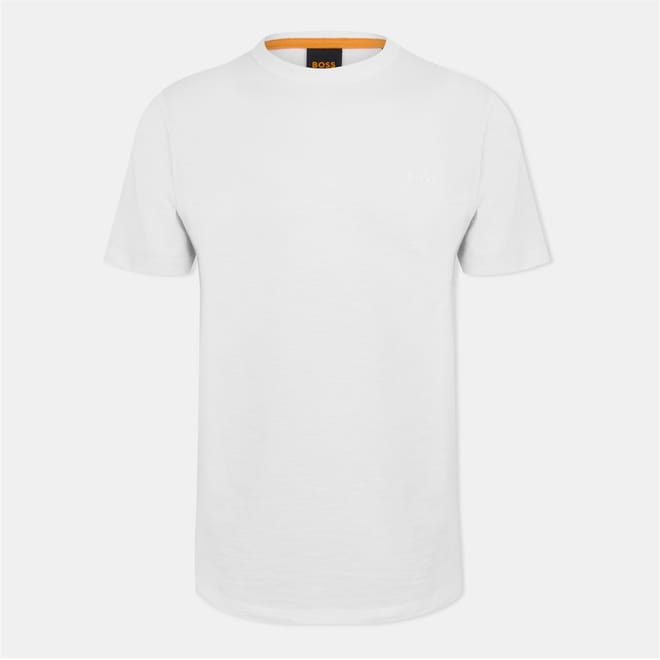 This Boss top features a classic crew neck and short sleeves, offering a regular fit. The solid pattern is complemented by a subtle logo embellishment, adding a touch of brand identity. Ideal for a versatile wardrobe staple. -